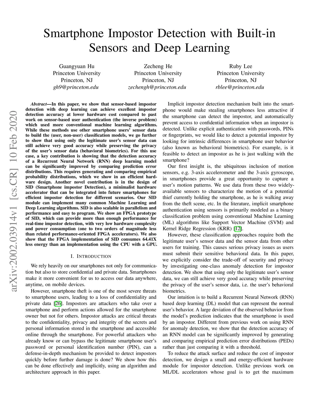 In this paper, we show that sensor-based impostor detection with deep learning can achieve excellent impostor detection accuracy at lower hardware cost compared to past work on sensor-based user authentication (the inverse problem) which used more conventional machine learning algorithms. While these methods use other smartphone users' sensor data to build the (user, non-user) classification models, we go further to show that using only the legitimate user's sensor data can still achieve very good accuracy while preserving the privacy of the user's sensor data (behavioral biometrics). For this use case, a key contribution is showing that the detection accuracy of a Recurrent Neural Network (RNN) deep learning model can be significantly improved by comparing prediction error distributions. This requires generating and comparing empirical probability distributions, which we show in an efficient hardware design. Another novel contribution is in the design of SID (Smartphone impostor Detection), a minimalist hardware accelerator that can be integrated into future smartphones for efficient impostor detection for different scenarios. Our SID module can implement many common Machine Learning and Deep Learning algorithms. SID is also scalable in parallelism and performance and easy to program. We show an FPGA prototype of SID, which can provide more than enough performance for real-time impostor detection, with very low hardware complexity and power consumption (one to two orders of magnitude less than related performance-oriented FPGA accelerators). We also show that the FPGA implementation of SID consumes 64.41X less energy than an implementation using the CPU with a GPU.