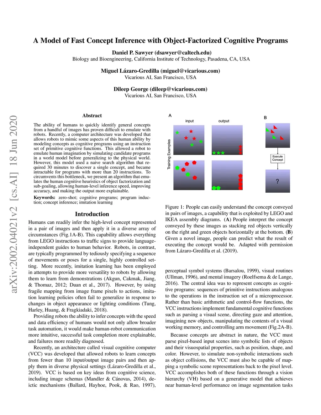 The ability of humans to quickly identify general concepts from a handful of images has proven difficult to emulate with robots. Recently, a computer architecture was developed that allows robots to mimic some aspects of this human ability by modeling concepts as cognitive programs using an instruction set of primitive cognitive functions. This allowed a robot to emulate human imagination by simulating candidate programs in a world model before generalizing to the physical world. However, this model used a naive search algorithm that required 30 minutes to discover a single concept, and became intractable for programs with more than 20 instructions. To circumvent this bottleneck, we present an algorithm that emulates the human cognitive heuristics of object factorization and sub-goaling, allowing human-level inference speed, improving accuracy, and making the output more explainable.