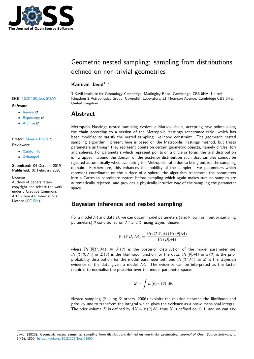 Metropolis Hastings nested sampling evolves a Markov chain, accepting new points along the chain according to a version of the Metropolis Hastings acceptance ratio, which has been modified to satisfy the nested sampling likelihood constraint. The geometric nested sampling algorithm I present here is based on the Metropolis Hastings method, but treats parameters as though they represent points on certain geometric objects, namely circles, tori and spheres. For parameters which represent points on a circle or torus, the trial distribution is "wrapped" around the domain of the posterior distribution such that samples cannot be rejected automatically when evaluating the Metropolis ratio due to being outside the sampling domain. Furthermore, this enhances the mobility of the sampler. For parameters which represent coordinates on the surface of a sphere, the algorithm transforms the parameters into a Cartesian coordinate system before sampling which again makes sure no samples are automatically rejected, and provides a physically intuitive way of the sampling the parameter space.