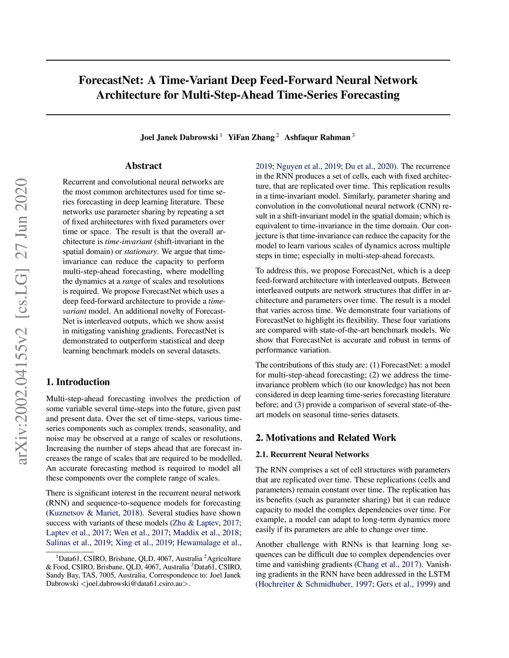 Recurrent and convolutional neural networks are the most common architectures used for time series forecasting in deep learning literature. These networks use parameter sharing by repeating a set of fixed architectures with fixed parameters over time or space. The result is that the overall architecture is time-invariant (shift-invariant in the spatial domain) or stationary. We argue that time-invariance can reduce the capacity to perform multi-step-ahead forecasting, where modelling the dynamics at a range of scales and resolutions is required. We propose ForecastNet which uses a deep feed-forward architecture to provide a time-variant model. An additional novelty of ForecastNet is interleaved outputs, which we show assist in mitigating vanishing gradients. ForecastNet is demonstrated to outperform statistical and deep learning benchmark models on several datasets.