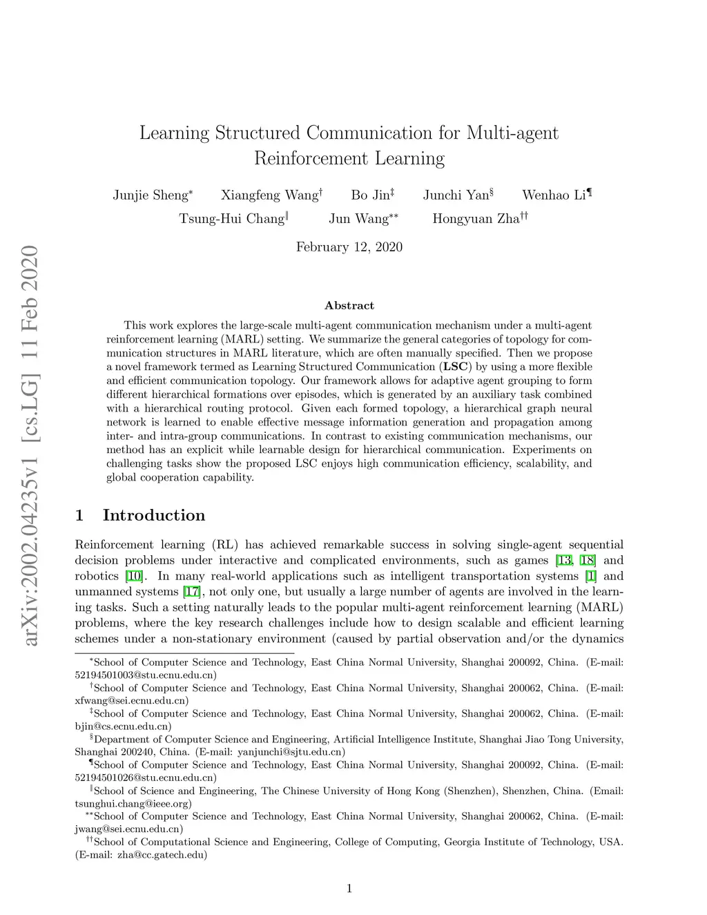 This work explores the large-scale multi-agent communication mechanism under a multi-agent reinforcement learning (MARL) setting. We summarize the general categories of topology for communication structures in MARL literature, which are often manually specified. Then we propose a novel framework termed as Learning Structured Communication (LSC) by using a more flexible and efficient communication topology. Our framework allows for adaptive agent grouping to form different hierarchical formations over episodes, which is generated by an auxiliary task combined with a hierarchical routing protocol. Given each formed topology, a hierarchical graph neural network is learned to enable effective message information generation and propagation among inter- and intra-group communications. In contrast to existing communication mechanisms, our method has an explicit while learnable design for hierarchical communication. Experiments on challenging tasks show the proposed LSC enjoys high communication efficiency, scalability, and global cooperation capability.