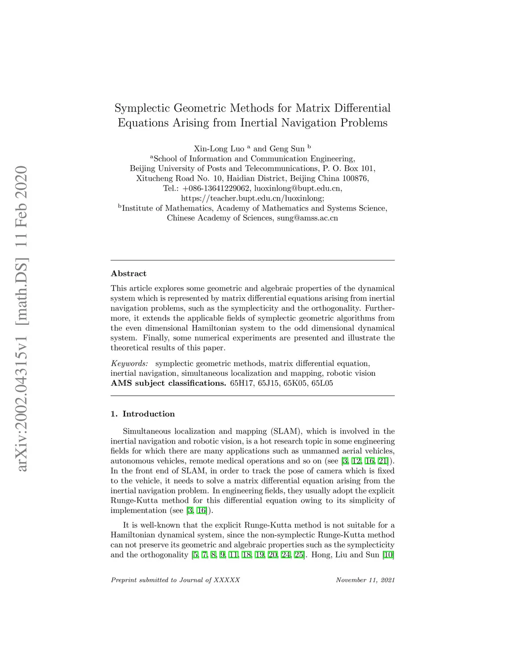 This article explores some geometric and algebraic properties of the dynamical system which is represented by matrix differential equations arising from inertial navigation problems, such as the symplecticity and the orthogonality. Furthermore, it extends the applicable fields of symplectic geometric algorithms from the even dimensional Hamiltonian system to the odd dimensional dynamical system. Finally, some numerical experiments are presented and illustrate the theoretical results of this paper.