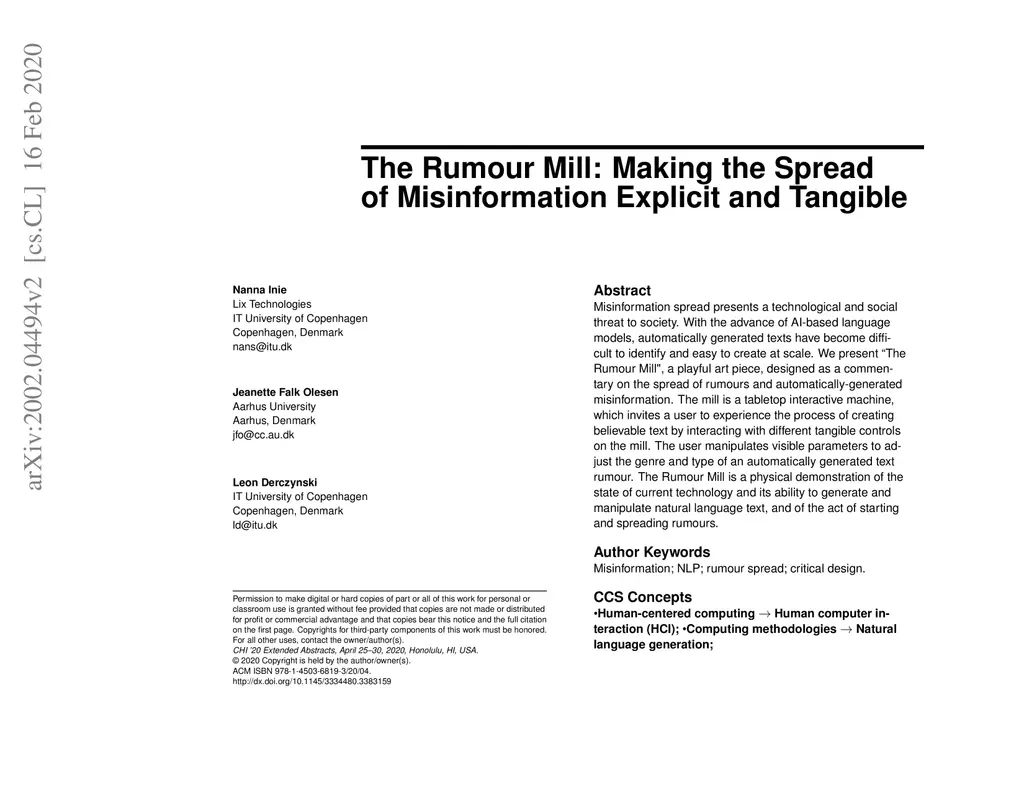 Misinformation spread presents a technological and social threat to society. With the advance of AI-based language models, automatically generated texts have become difficult to identify and easy to create at scale. We present "The Rumour Mill", a playful art piece, designed as a commentary on the spread of rumours and automatically-generated misinformation. The mill is a tabletop interactive machine, which invites a user to experience the process of creating believable text by interacting with different tangible controls on the mill. The user manipulates visible parameters to adjust the genre and type of an automatically generated text rumour. The Rumour Mill is a physical demonstration of the state of current technology and its ability to generate and manipulate natural language text, and of the act of starting and spreading rumours.