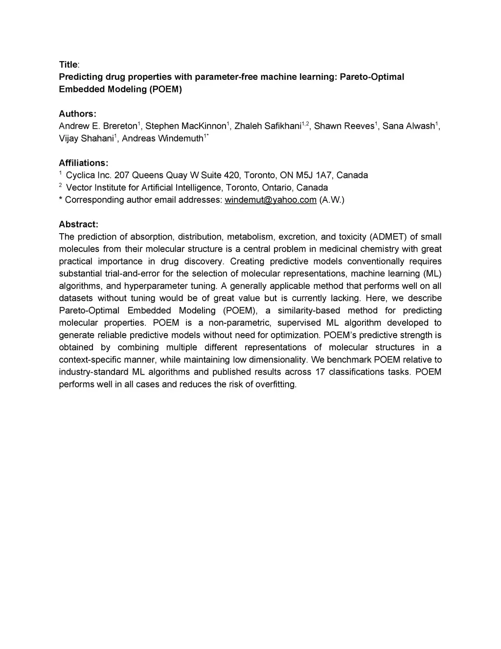 The prediction of absorption, distribution, metabolism, excretion, and toxicity (ADMET) of small molecules from their molecular structure is a central problem in medicinal chemistry with great practical importance in drug discovery. Creating predictive models conventionally requires substantial trial-and-error for the selection of molecular representations, machine learning (ML) algorithms, and hyperparameter tuning. A generally applicable method that performs well on all datasets without tuning would be of great value but is currently lacking. Here, we describe Pareto-Optimal Embedded Modeling (POEM), a similarity-based method for predicting molecular properties. POEM is a non-parametric, supervised ML algorithm developed to generate reliable predictive models without need for optimization. POEMs predictive strength is obtained by combining multiple different representations of molecular structures in a context-specific manner, while maintaining low dimensionality. We benchmark POEM relative to industry-standard ML algorithms and published results across 17 classifications tasks. POEM performs well in all cases and reduces the risk of overfitting.