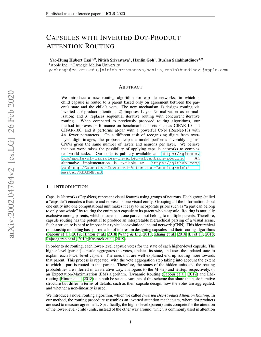 We introduce a new routing algorithm for capsule networks, in which a child capsule is routed to a parent based only on agreement between the parent's state and the child's vote. The new mechanism 1) designs routing via inverted dot-product attention; 2) imposes Layer Normalization as normalization; and 3) replaces sequential iterative routing with concurrent iterative routing. When compared to previously proposed routing algorithms, our method improves performance on benchmark datasets such as CIFAR-10 and CIFAR-100, and it performs at-par with a powerful CNN (ResNet-18) with 4x fewer parameters. On a different task of recognizing digits from overlayed digit images, the proposed capsule model performs favorably against CNNs given the same number of layers and neurons per layer. We believe that our work raises the possibility of applying capsule networks to complex real-world tasks. Our code is publicly available at: https://github.com/apple/ml-capsules-inverted-attention-routing