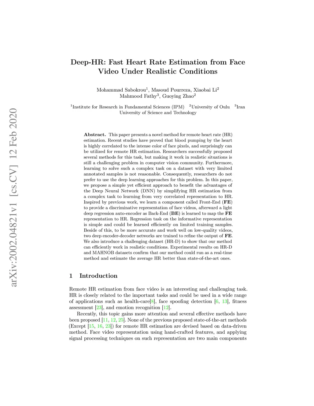 This paper presents a novel method for remote heart rate (HR) estimation. Recent studies have proved that blood pumping by the heart is highly correlated to the intense color of face pixels, and surprisingly can be utilized for remote HR estimation. Researchers successfully proposed several methods for this task, but making it work in realistic situations is still a challenging problem in computer vision community. Furthermore, learning to solve such a complex task on a dataset with very limited annotated samples is not reasonable. Consequently, researchers do not prefer to use the deep learning approaches for this problem. In this paper, we propose a simple yet efficient approach to benefit the advantages of the Deep Neural Network (DNN) by simplifying HR estimation from a complex task to learning from very correlated representation to HR. Inspired by previous work, we learn a component called Front-End (FE) to provide a discriminative representation of face videos, afterward a light deep regression auto-encoder as Back-End (BE) is learned to map the FE representation to HR. Regression task on the informative representation is simple and could be learned efficiently on limited training samples. Beside of this, to be more accurate and work well on low-quality videos, two deep encoder-decoder networks are trained to refine the output of FE. We also introduce a challenging dataset (HR-D) to show that our method can efficiently work in realistic conditions. Experimental results on HR-D and MAHNOB datasets confirm that our method could run as a real-time method and estimate the average HR better than state-of-the-art ones.