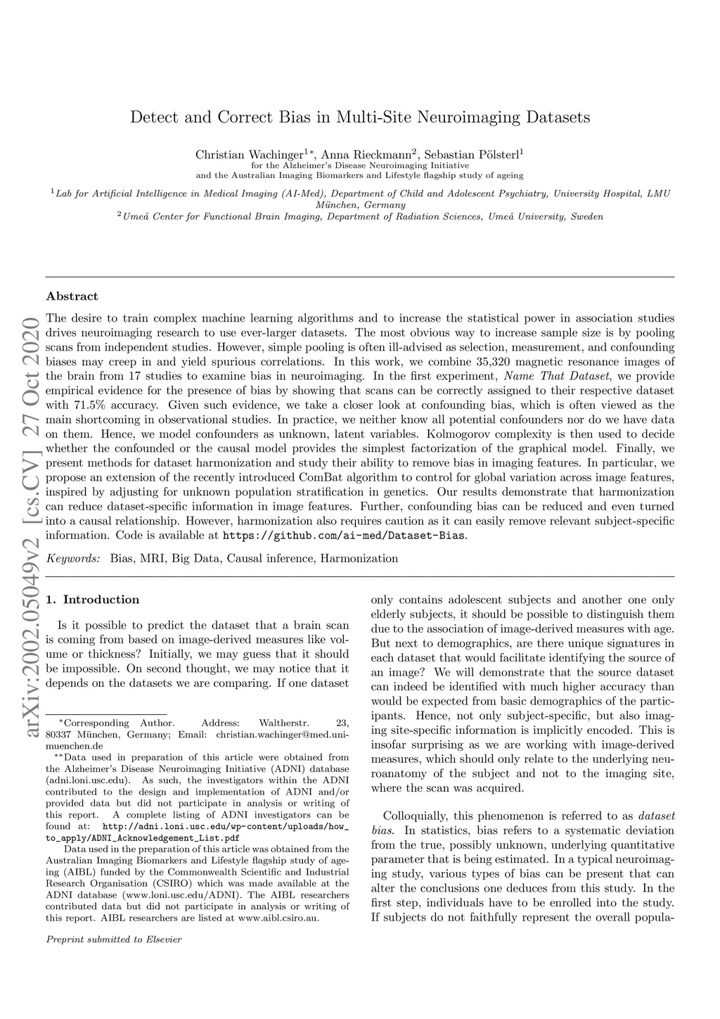The desire to train complex machine learning algorithms and to increase the statistical power in association studies drives neuroimaging research to use ever-larger datasets. The most obvious way to increase sample size is by pooling scans from independent studies. However, simple pooling is often ill-advised as selection, measurement, and confounding biases may creep in and yield spurious correlations. In this work, we combine 35,320 magnetic resonance images of the brain from 17 studies to examine bias in neuroimaging. In the first experiment, Name That Dataset, we provide empirical evidence for the presence of bias by showing that scans can be correctly assigned to their respective dataset with 71.5% accuracy. Given such evidence, we take a closer look at confounding bias, which is often viewed as the main shortcoming in observational studies. In practice, we neither know all potential confounders nor do we have data on them. Hence, we model confounders as unknown, latent variables. Kolmogorov complexity is then used to decide whether the confounded or the causal model provides the simplest factorization of the graphical model. Finally, we present methods for dataset harmonization and study their ability to remove bias in imaging features. In particular, we propose an extension of the recently introduced ComBat algorithm to control for global variation across image features, inspired by adjusting for population stratification in genetics. Our results demonstrate that harmonization can reduce dataset-specific information in image features. Further, confounding bias can be reduced and even turned into a causal relationship. However, harmonziation also requires caution as it can easily remove relevant subject-specific information. Code is available at https://github.com/ai-med/Dataset-Bias.
