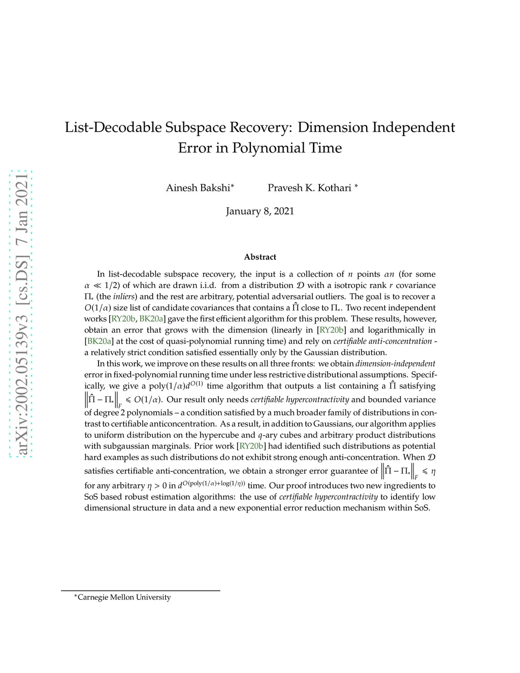 In list-decodable subspace recovery, the input is a collection of points (for some ) of which are drawn i.i.d. from a distribution with a isotropic rank covariance (the \emph{inliers}) and the rest are arbitrary, potential adversarial outliers. The goal is to recover a size list of candidate covariances that contains a close to . Two recent independent works (Raghavendra-Yau, Bakshi-Kothari 2020) gave the first efficient algorithm for this problem. These results, however, obtain an error that grows with the dimension (linearly in [RY] and logarithmically in BK) at the cost of quasi-polynomial running time) and rely on \emph{certifiable anti-concentration} - a relatively strict condition satisfied essentially only by the Gaussian distribution. In this work, we improve on these results on all three fronts: \emph{dimension-independent} error via a faster fixed-polynomial running time under less restrictive distributional assumptions. Specifically, we give a time algorithm that outputs a list containing a satisfying . Our result only needs to have \emph{certifiably hypercontractive} degree 2 polynomials. As a result, in addition to Gaussians, our algorithm applies to the uniform distribution on the hypercube and -ary cubes and arbitrary product distributions with subgaussian marginals. Prior work (Raghavendra and Yau, 2020) had identified such distributions as potential hard examples as such distributions do not exhibit strong enough anti-concentration. When satisfies certifiable anti-concentration, we obtain a stronger error guarantee of for any arbitrary in time.