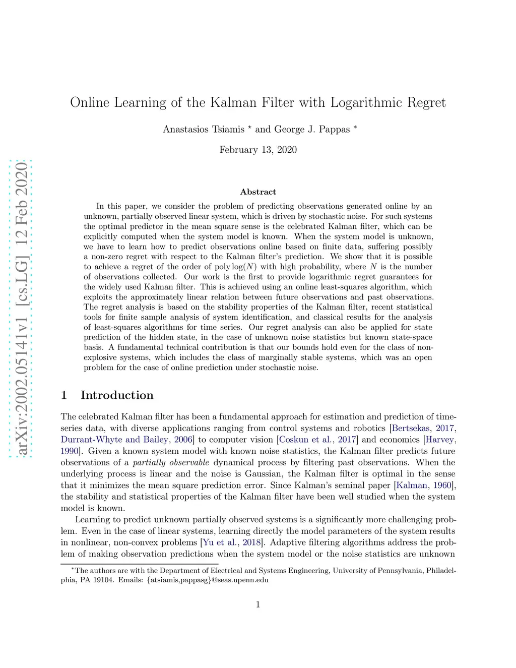In this paper, we consider the problem of predicting observations generated online by an unknown, partially observed linear system, which is driven by stochastic noise. For such systems the optimal predictor in the mean square sense is the celebrated Kalman filter, which can be explicitly computed when the system model is known. When the system model is unknown, we have to learn how to predict observations online based on finite data, suffering possibly a non-zero regret with respect to the Kalman filter's prediction. We show that it is possible to achieve a regret of the order of with high probability, where is the number of observations collected. Our work is the first to provide logarithmic regret guarantees for the widely used Kalman filter. This is achieved using an online least-squares algorithm, which exploits the approximately linear relation between future observations and past observations. The regret analysis is based on the stability properties of the Kalman filter, recent statistical tools for finite sample analysis of system identification, and classical results for the analysis of least-squares algorithms for time series. Our regret analysis can also be applied for state prediction of the hidden state, in the case of unknown noise statistics but known state-space basis. A fundamental technical contribution is that our bounds hold even for the class of non-explosive systems, which includes the class of marginally stable systems, which was an open problem for the case of online prediction under stochastic noise.