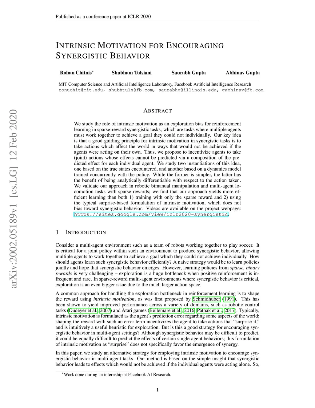 We study the role of intrinsic motivation as an exploration bias for reinforcement learning in sparse-reward synergistic tasks, which are tasks where multiple agents must work together to achieve a goal they could not individually. Our key idea is that a good guiding principle for intrinsic motivation in synergistic tasks is to take actions which affect the world in ways that would not be achieved if the agents were acting on their own. Thus, we propose to incentivize agents to take (joint) actions whose effects cannot be predicted via a composition of the predicted effect for each individual agent. We study two instantiations of this idea, one based on the true states encountered, and another based on a dynamics model trained concurrently with the policy. While the former is simpler, the latter has the benefit of being analytically differentiable with respect to the action taken. We validate our approach in robotic bimanual manipulation and multi-agent locomotion tasks with sparse rewards; we find that our approach yields more efficient learning than both 1) training with only the sparse reward and 2) using the typical surprise-based formulation of intrinsic motivation, which does not bias toward synergistic behavior. Videos are available on the project webpage: https://sites.google.com/view/iclr2020-synergistic.