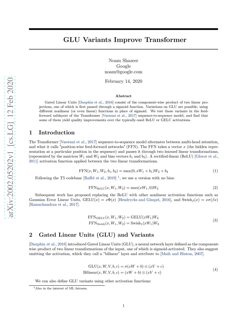 Gated Linear Units (arXiv:1612.08083) consist of the component-wise product of two linear projections, one of which is first passed through a sigmoid function. Variations on GLU are possible, using different nonlinear (or even linear) functions in place of sigmoid. We test these variants in the feed-forward sublayers of the Transformer (arXiv:1706.03762) sequence-to-sequence model, and find that some of them yield quality improvements over the typically-used ReLU or GELU activations.