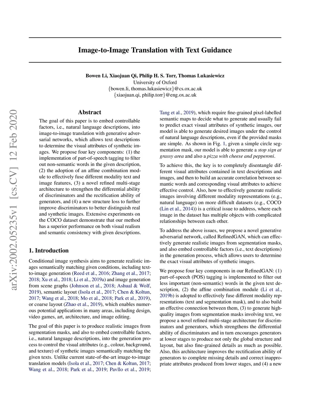 The goal of this paper is to embed controllable factors, i.e., natural language descriptions, into image-to-image translation with generative adversarial networks, which allows text descriptions to determine the visual attributes of synthetic images. We propose four key components: (1) the implementation of part-of-speech tagging to filter out non-semantic words in the given description, (2) the adoption of an affine combination module to effectively fuse different modality text and image features, (3) a novel refined multi-stage architecture to strengthen the differential ability of discriminators and the rectification ability of generators, and (4) a new structure loss to further improve discriminators to better distinguish real and synthetic images. Extensive experiments on the COCO dataset demonstrate that our method has a superior performance on both visual realism and semantic consistency with given descriptions.