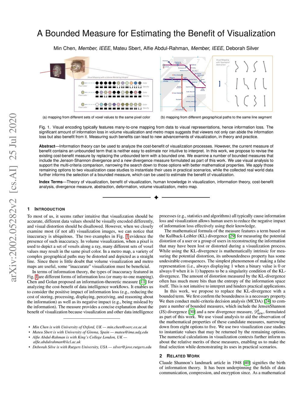 Information theory can be used to analyze the cost-benefit of visualization processes. However, the current measure of benefit contains an unbounded term that is neither easy to estimate nor intuitive to interpret. In this work, we propose to revise the existing cost-benefit measure by replacing the unbounded term with a bounded one. We examine a number of bounded measures that include the Jenson-Shannon divergence and a new divergence measure formulated as part of this work. We use visual analysis to support the multi-criteria comparison, narrowing the search down to those options with better mathematical properties. We apply those remaining options to two visualization case studies to instantiate their uses in practical scenarios, while the collected real world data further informs the selection of a bounded measure, which can be used to estimate the benefit of visualization.