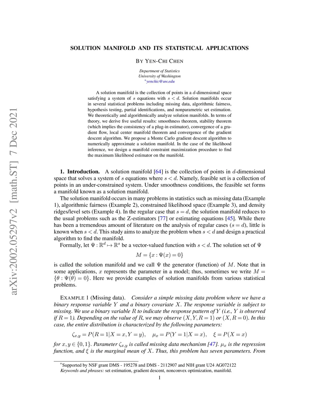 A solution manifold is the collection of points in a -dimensional space satisfying a system of equations with . Solution manifolds occur in several statistical problems including hypothesis testing, curved-exponential families, constrained mixture models, partial identifications, and nonparametric set estimation. We analyze solution manifolds both theoretically and algorithmically. In terms of theory, we derive five useful results: the smoothness theorem, the stability theorem (which implies the consistency of a plug-in estimator), the convergence of a gradient flow, the local center manifold theorem and the convergence of the gradient descent algorithm. To numerically approximate a solution manifold, we propose a Monte Carlo gradient descent algorithm. In the case of likelihood inference, we design a manifold constraint maximization procedure to find the maximum likelihood estimator on the manifold. We also develop a method to approximate a posterior distribution defined on a solution manifold.