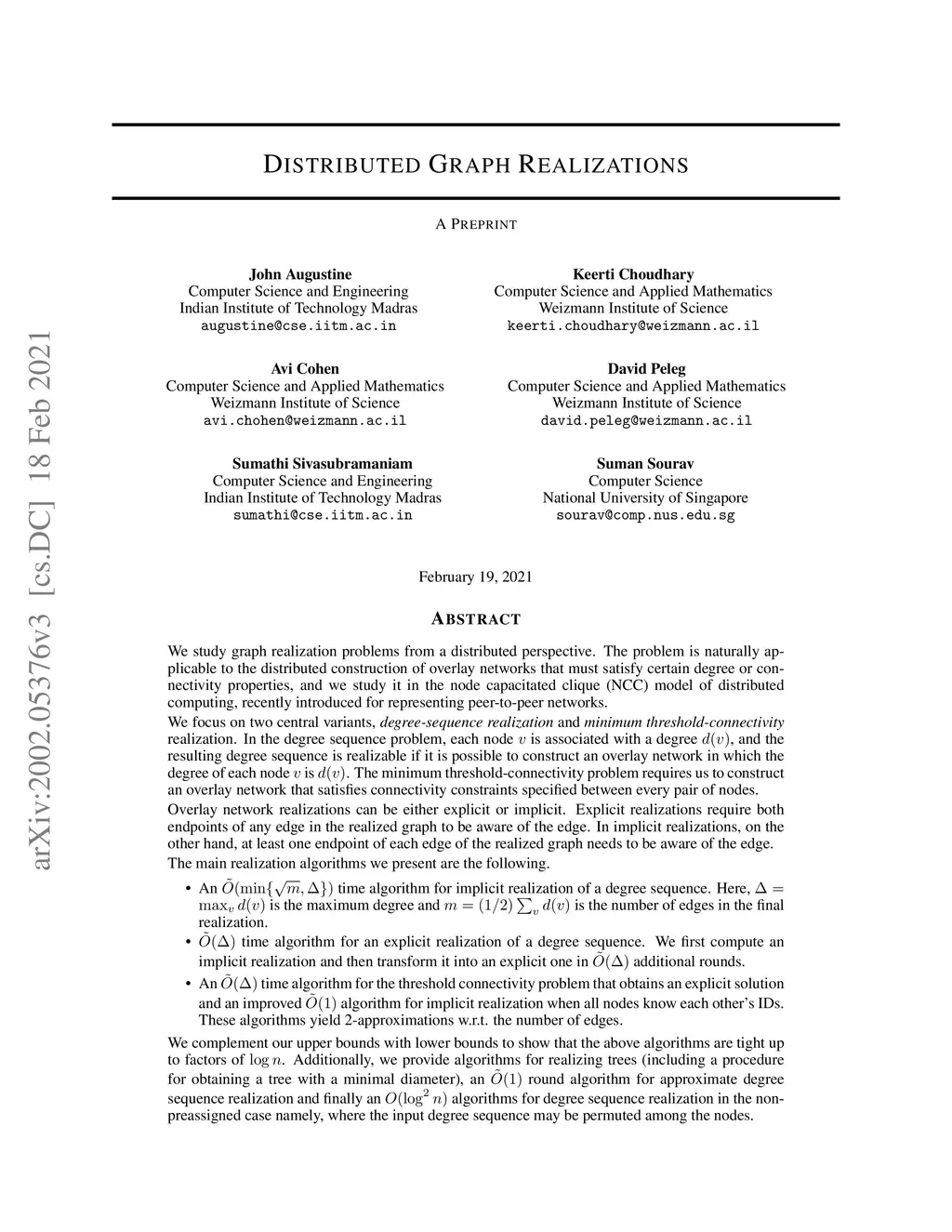 We study graph realization problems from a distributed perspective and we study it in the node capacitated clique (NCC) model of distributed computing, recently introduced for representing peer-to-peer networks. We focus on two central variants, degree-sequence realization and minimum threshold-connectivity realization both of which result in overlay network realizations. Overlay network realizations can be either explicit or implicit. Explicit realizations require both endpoints of any edge in the realized graph to be aware of the edge. In implicit realizations, on the other hand, at least one endpoint of each edge of the realized graph needs to be aware of the edge. The main realization algorithms we present are the following. 1. An time algorithm for implicit realization of a degree sequence. Here, is the maximum degree and is the number of edges in the final realization. An time algorithm for an explicit realization of a degree sequence. We first compute an implicit realization and then transform it into an explicit one in additional rounds. 2. An time algorithm for the threshold connectivity problem that obtains an explicit solution and an improved algorithm for implicit realization when all nodes know each other's IDs. These algorithms are 2-approximations w.r.t. the number of edges. We complement our upper bounds with lower bounds to show that the above algorithms are tight up to factors of . Additionally, we provide algorithms for realizing trees and an round algorithm for approximate degree sequence realization.