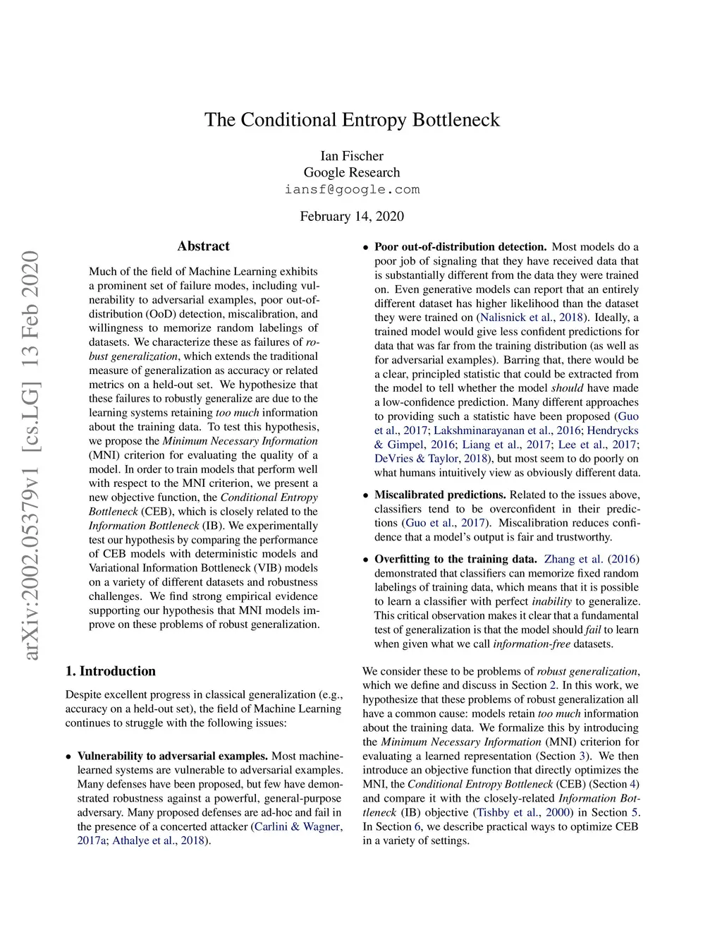 Much of the field of Machine Learning exhibits a prominent set of failure modes, including vulnerability to adversarial examples, poor out-of-distribution (OoD) detection, miscalibration, and willingness to memorize random labelings of datasets. We characterize these as failures of robust generalization, which extends the traditional measure of generalization as accuracy or related metrics on a held-out set. We hypothesize that these failures to robustly generalize are due to the learning systems retaining too much information about the training data. To test this hypothesis, we propose the Minimum Necessary Information (MNI) criterion for evaluating the quality of a model. In order to train models that perform well with respect to the MNI criterion, we present a new objective function, the Conditional Entropy Bottleneck (CEB), which is closely related to the Information Bottleneck (IB). We experimentally test our hypothesis by comparing the performance of CEB models with deterministic models and Variational Information Bottleneck (VIB) models on a variety of different datasets and robustness challenges. We find strong empirical evidence supporting our hypothesis that MNI models improve on these problems of robust generalization.