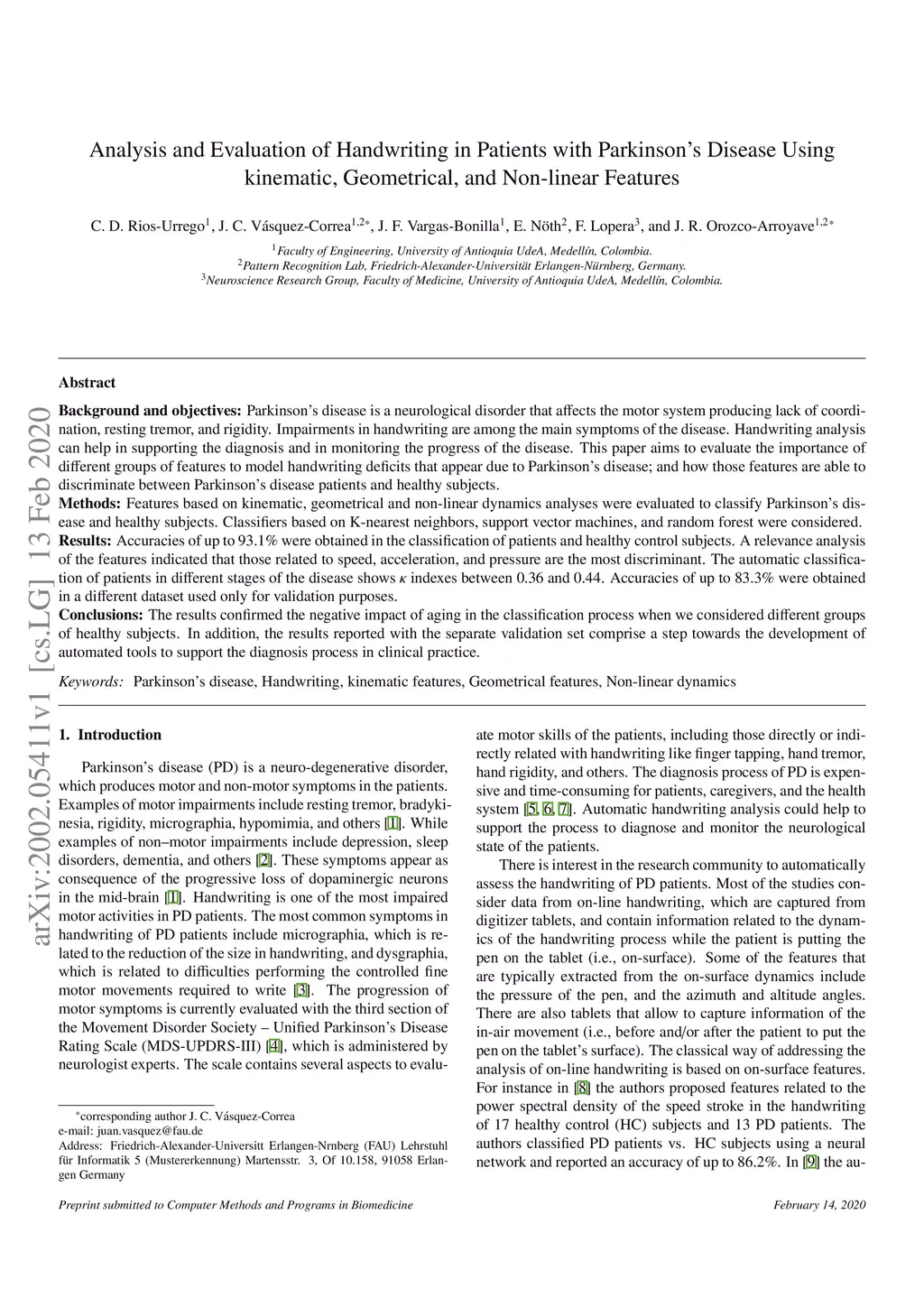 Disease Using kinematic, Geometrical, and Non-linear Features