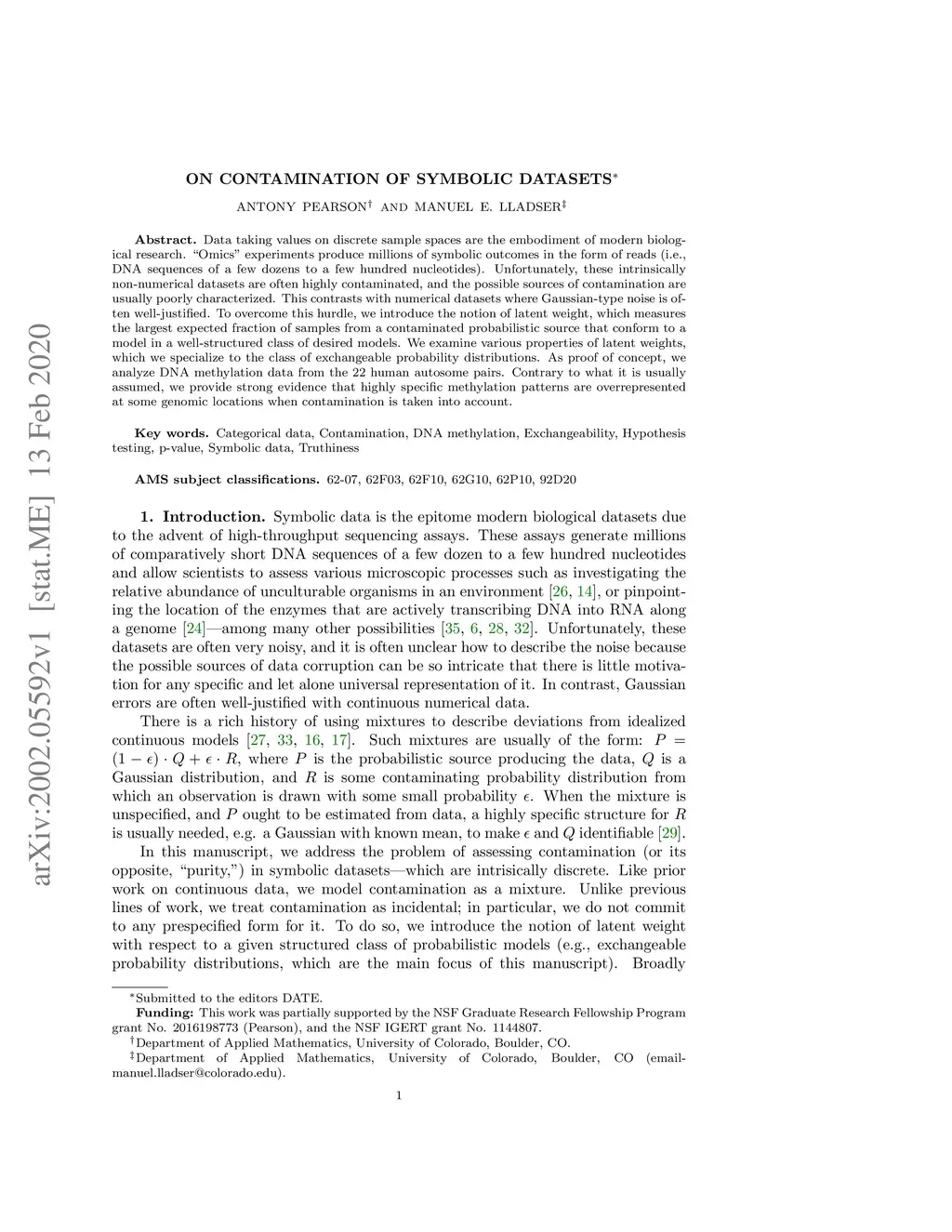Data taking values on discrete sample spaces are the embodiment of modern biological research. "Omics" experiments produce millions of symbolic outcomes in the form of reads (i.e., DNA sequences of a few dozens to a few hundred nucleotides). Unfortunately, these intrinsically non-numerical datasets are often highly contaminated, and the possible sources of contamination are usually poorly characterized. This contrasts with numerical datasets where Gaussian-type noise is often well-justified. To overcome this hurdle, we introduce the notion of latent weight, which measures the largest expected fraction of samples from a contaminated probabilistic source that conform to a model in a well-structured class of desired models. We examine various properties of latent weights, which we specialize to the class of exchangeable probability distributions. As proof of concept, we analyze DNA methylation data from the 22 human autosome pairs. Contrary to what it is usually assumed, we provide strong evidence that highly specific methylation patterns are overrepresented at some genomic locations when contamination is taken into account.