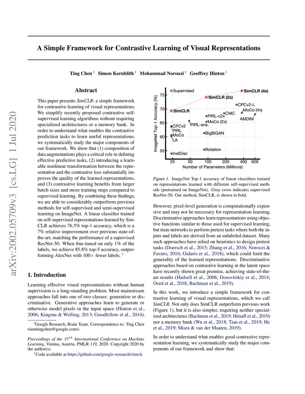 This paper presents SimCLR: a simple framework for contrastive learning of visual representations. We simplify recently proposed contrastive self-supervised learning algorithms without requiring specialized architectures or a memory bank. In order to understand what enables the contrastive prediction tasks to learn useful representations, we systematically study the major components of our framework. We show that (1) composition of data augmentations plays a critical role in defining effective predictive tasks, (2) introducing a learnable nonlinear transformation between the representation and the contrastive loss substantially improves the quality of the learned representations, and (3) contrastive learning benefits from larger batch sizes and more training steps compared to supervised learning. By combining these findings, we are able to considerably outperform previous methods for self-supervised and semi-supervised learning on ImageNet. A linear classifier trained on self-supervised representations learned by SimCLR achieves 76.5% top-1 accuracy, which is a 7% relative improvement over previous state-of-the-art, matching the performance of a supervised ResNet-50. When fine-tuned on only 1% of the labels, we achieve 85.8% top-5 accuracy, outperforming AlexNet with 100X fewer labels.