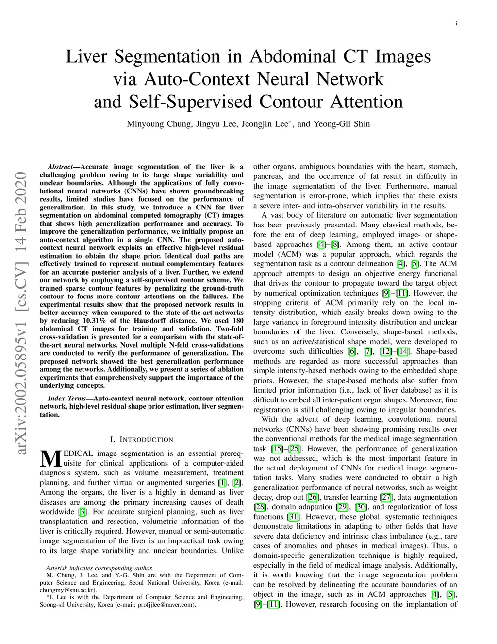 Accurate image segmentation of the liver is a challenging problem owing to its large shape variability and unclear boundaries. Although the applications of fully convolutional neural networks (CNNs) have shown groundbreaking results, limited studies have focused on the performance of generalization. In this study, we introduce a CNN for liver segmentation on abdominal computed tomography (CT) images that shows high generalization performance and accuracy. To improve the generalization performance, we initially propose an auto-context algorithm in a single CNN. The proposed auto-context neural network exploits an effective high-level residual estimation to obtain the shape prior. Identical dual paths are effectively trained to represent mutual complementary features for an accurate posterior analysis of a liver. Further, we extend our network by employing a self-supervised contour scheme. We trained sparse contour features by penalizing the ground-truth contour to focus more contour attentions on the failures. The experimental results show that the proposed network results in better accuracy when compared to the state-of-the-art networks by reducing 10.31% of the Hausdorff distance. We used 180 abdominal CT images for training and validation. Two-fold cross-validation is presented for a comparison with the state-of-the-art neural networks. Novel multiple N-fold cross-validations are conducted to verify the performance of generalization. The proposed network showed the best generalization performance among the networks. Additionally, we present a series of ablation experiments that comprehensively support the importance of the underlying concepts.