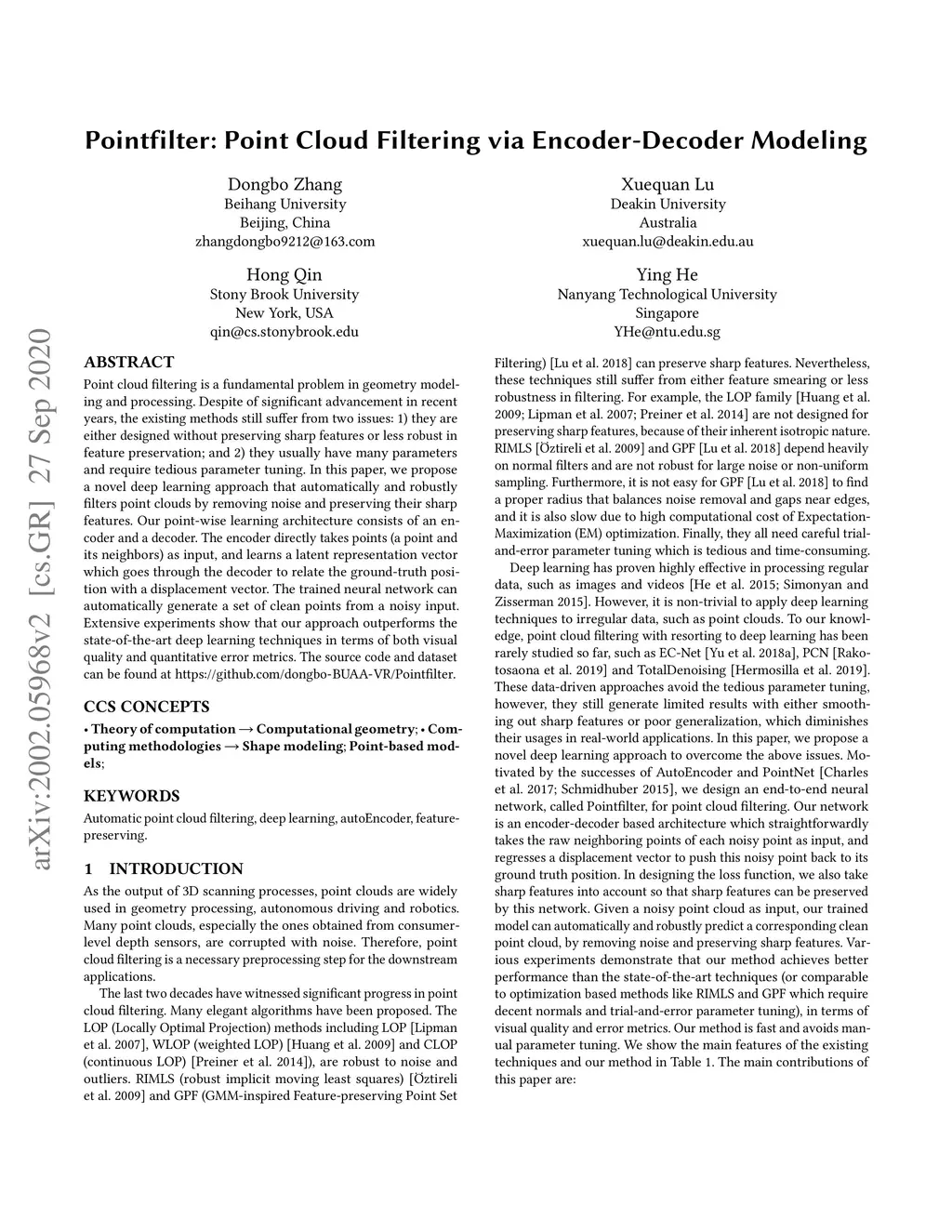 Pointfilter: Point Cloud Filtering via Encoder-Decoder Modeling