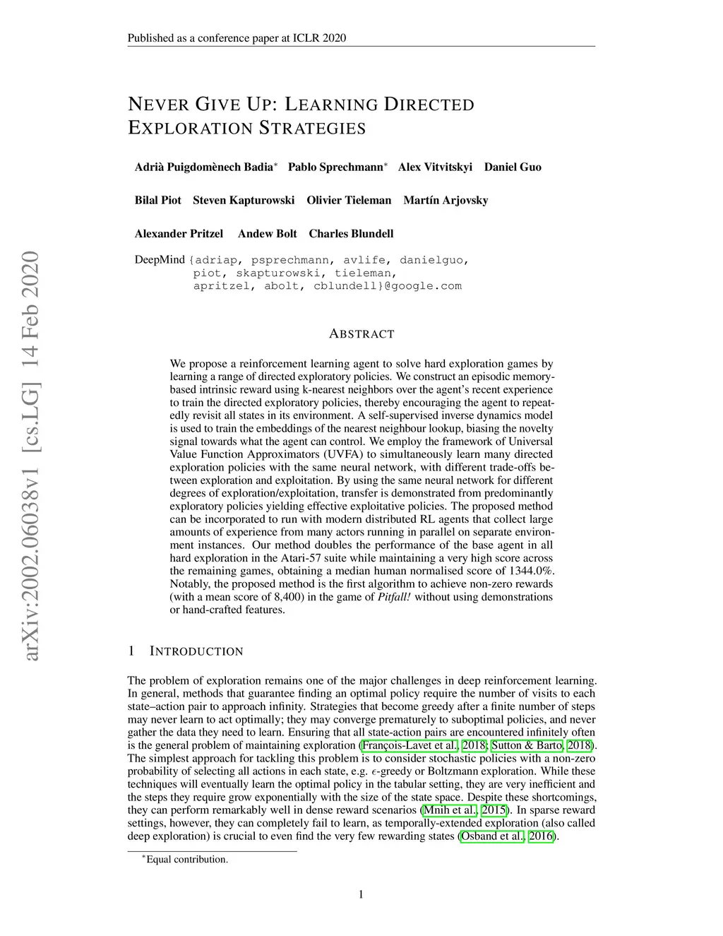 We propose a reinforcement learning agent to solve hard exploration games by learning a range of directed exploratory policies. We construct an episodic memory-based intrinsic reward using k-nearest neighbors over the agent's recent experience to train the directed exploratory policies, thereby encouraging the agent to repeatedly revisit all states in its environment. A self-supervised inverse dynamics model is used to train the embeddings of the nearest neighbour lookup, biasing the novelty signal towards what the agent can control. We employ the framework of Universal Value Function Approximators (UVFA) to simultaneously learn many directed exploration policies with the same neural network, with different trade-offs between exploration and exploitation. By using the same neural network for different degrees of exploration/exploitation, transfer is demonstrated from predominantly exploratory policies yielding effective exploitative policies. The proposed method can be incorporated to run with modern distributed RL agents that collect large amounts of experience from many actors running in parallel on separate environment instances. Our method doubles the performance of the base agent in all hard exploration in the Atari-57 suite while maintaining a very high score across the remaining games, obtaining a median human normalised score of 1344.0%. Notably, the proposed method is the first algorithm to achieve non-zero rewards (with a mean score of 8,400) in the game of Pitfall! without using demonstrations or hand-crafted features.