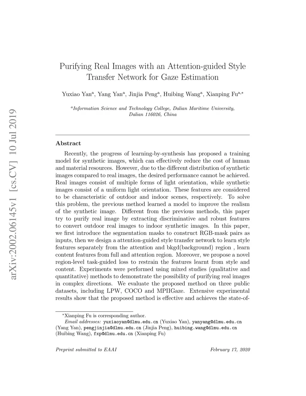 Recently, the progress of learning-by-synthesis has proposed a training model for synthetic images, which can effectively reduce the cost of human and material resources. However, due to the different distribution of synthetic images compared to real images, the desired performance cannot be achieved. Real images consist of multiple forms of light orientation, while synthetic images consist of a uniform light orientation. These features are considered to be characteristic of outdoor and indoor scenes, respectively. To solve this problem, the previous method learned a model to improve the realism of the synthetic image. Different from the previous methods, this paper try to purify real image by extracting discriminative and robust features to convert outdoor real images to indoor synthetic images. In this paper, we first introduce the segmentation masks to construct RGB-mask pairs as inputs, then we design a attention-guided style transfer network to learn style features separately from the attention and bkgd(background) region , learn content features from full and attention region. Moreover, we propose a novel region-level task-guided loss to restrain the features learnt from style and content. Experiments were performed using mixed studies (qualitative and quantitative) methods to demonstrate the possibility of purifying real images in complex directions. We evaluate the proposed method on three public datasets, including LPW, COCO and MPIIGaze. Extensive experimental results show that the proposed method is effective and achieves the state-of-the-art results.