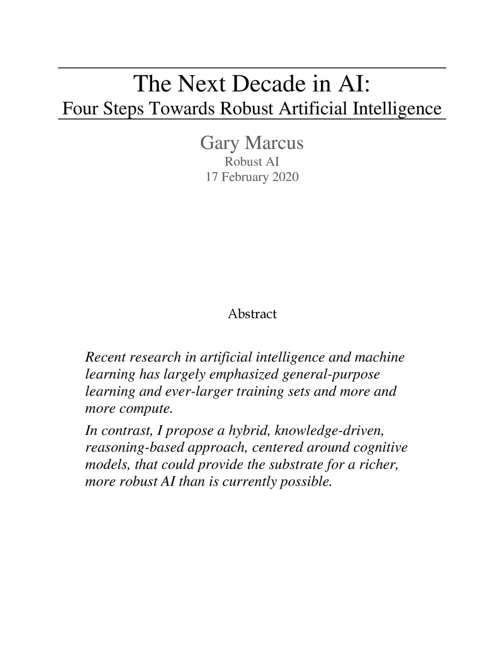 Recent research in artificial intelligence and machine learning has largely emphasized general-purpose learning and ever-larger training sets and more and more compute. In contrast, I propose a hybrid, knowledge-driven, reasoning-based approach, centered around cognitive models, that could provide the substrate for a richer, more robust AI than is currently possible.