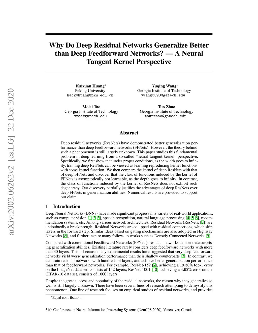 Deep residual networks (ResNets) have demonstrated better generalization performance than deep feedforward networks (FFNets). However, the theory behind such a phenomenon is still largely unknown. This paper studies this fundamental problem in deep learning from a so-called "neural tangent kernel" perspective. Specifically, we first show that under proper conditions, as the width goes to infinity, training deep ResNets can be viewed as learning reproducing kernel functions with some kernel function. We then compare the kernel of deep ResNets with that of deep FFNets and discover that the class of functions induced by the kernel of FFNets is asymptotically not learnable, as the depth goes to infinity. In contrast, the class of functions induced by the kernel of ResNets does not exhibit such degeneracy. Our discovery partially justifies the advantages of deep ResNets over deep FFNets in generalization abilities. Numerical results are provided to support our claim.
