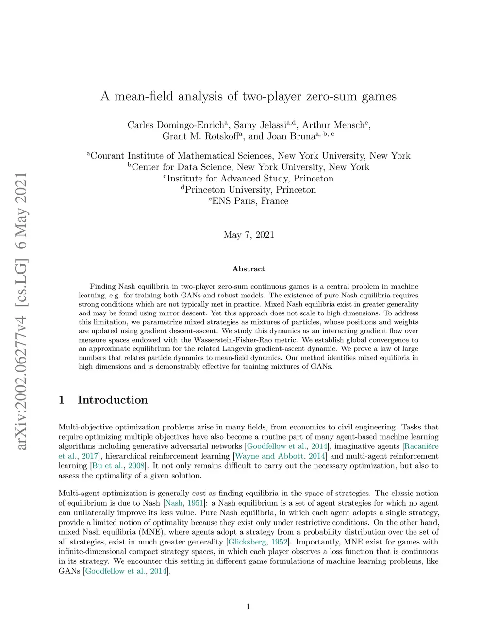 Finding Nash equilibria in two-player zero-sum continuous games is a central problem in machine learning, e.g. for training both GANs and robust models. The existence of pure Nash equilibria requires strong conditions which are not typically met in practice. Mixed Nash equilibria exist in greater generality and may be found using mirror descent. Yet this approach does not scale to high dimensions. To address this limitation, we parametrize mixed strategies as mixtures of particles, whose positions and weights are updated using gradient descent-ascent. We study this dynamics as an interacting gradient flow over measure spaces endowed with the Wasserstein-Fisher-Rao metric. We establish global convergence to an approximate equilibrium for the related Langevin gradient-ascent dynamic. We prove a law of large numbers that relates particle dynamics to mean-field dynamics. Our method identifies mixed equilibria in high dimensions and is demonstrably effective for training mixtures of GANs.