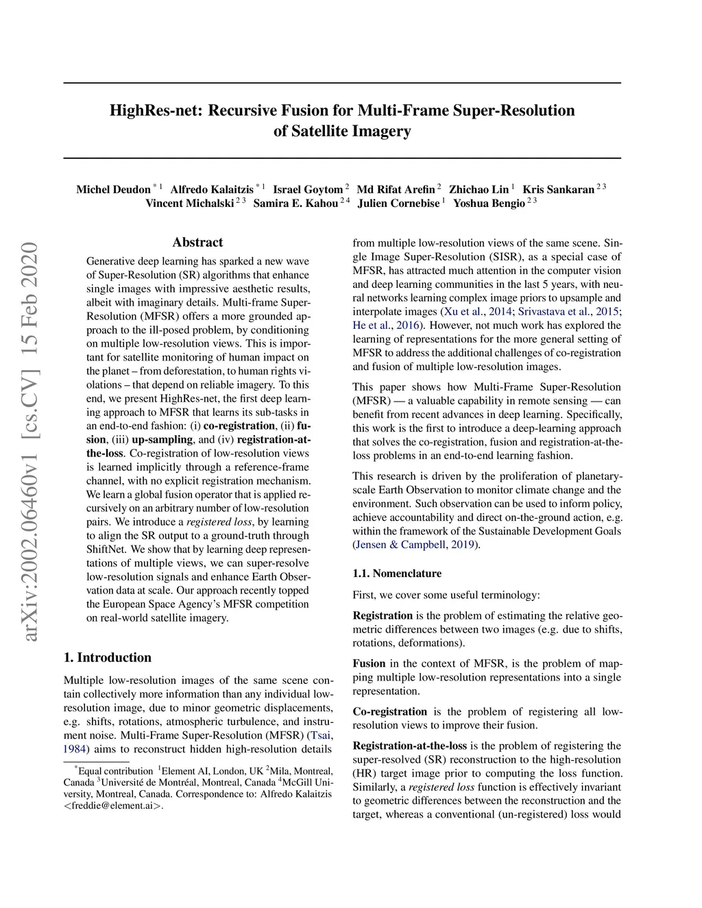 Generative deep learning has sparked a new wave of Super-Resolution (SR) algorithms that enhance single images with impressive aesthetic results, albeit with imaginary details. Multi-frame Super-Resolution (MFSR) offers a more grounded approach to the ill-posed problem, by conditioning on multiple low-resolution views. This is important for satellite monitoring of human impact on the planet -- from deforestation, to human rights violations -- that depend on reliable imagery. To this end, we present HighRes-net, the first deep learning approach to MFSR that learns its sub-tasks in an end-to-end fashion: (i) co-registration, (ii) fusion, (iii) up-sampling, and (iv) registration-at-the-loss. Co-registration of low-resolution views is learned implicitly through a reference-frame channel, with no explicit registration mechanism. We learn a global fusion operator that is applied recursively on an arbitrary number of low-resolution pairs. We introduce a registered loss, by learning to align the SR output to a ground-truth through ShiftNet. We show that by learning deep representations of multiple views, we can super-resolve low-resolution signals and enhance Earth Observation data at scale. Our approach recently topped the European Space Agency's MFSR competition on real-world satellite imagery.