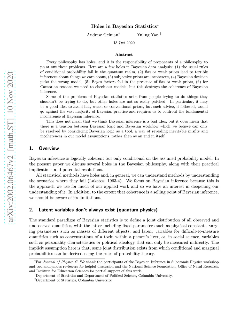 Every philosophy has holes, and it is the responsibility of proponents of a philosophy to point out these problems. Here are a few holes in Bayesian data analysis: (1) the usual rules of conditional probability fail in the quantum realm, (2) flat or weak priors lead to terrible inferences about things we care about, (3) subjective priors are incoherent, (4) Bayesian decision picks the wrong model, (5) Bayes factors fail in the presence of flat or weak priors, (6) for Cantorian reasons we need to check our models, but this destroys the coherence of Bayesian inference. Some of the problems of Bayesian statistics arise from people trying to do things they shouldn't be trying to do, but other holes are not so easily patched. In particular, it may be a good idea to avoid flat, weak, or conventional priors, but such advice, if followed, would go against the vast majority of Bayesian practice and requires us to confront the fundamental incoherence of Bayesian inference. This does not mean that we think Bayesian inference is a bad idea, but it does mean that there is a tension between Bayesian logic and Bayesian workflow which we believe can only be resolved by considering Bayesian logic as a tool, a way of revealing inevitable misfits and incoherences in our model assumptions, rather than as an end in itself.