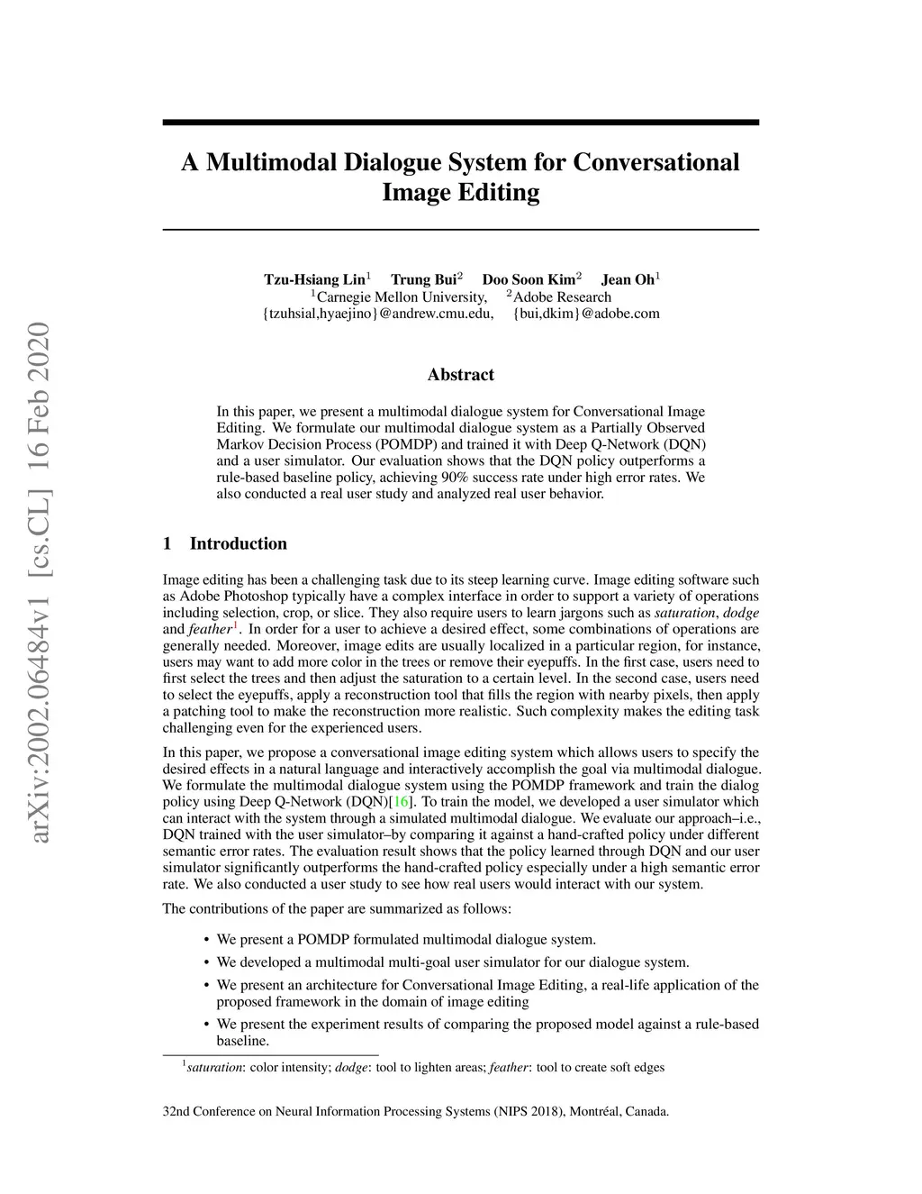 In this paper, we present a multimodal dialogue system for Conversational Image Editing. We formulate our multimodal dialogue system as a Partially Observed Markov Decision Process (POMDP) and trained it with Deep Q-Network (DQN) and a user simulator. Our evaluation shows that the DQN policy outperforms a rule-based baseline policy, achieving 90\% success rate under high error rates. We also conducted a real user study and analyzed real user behavior.