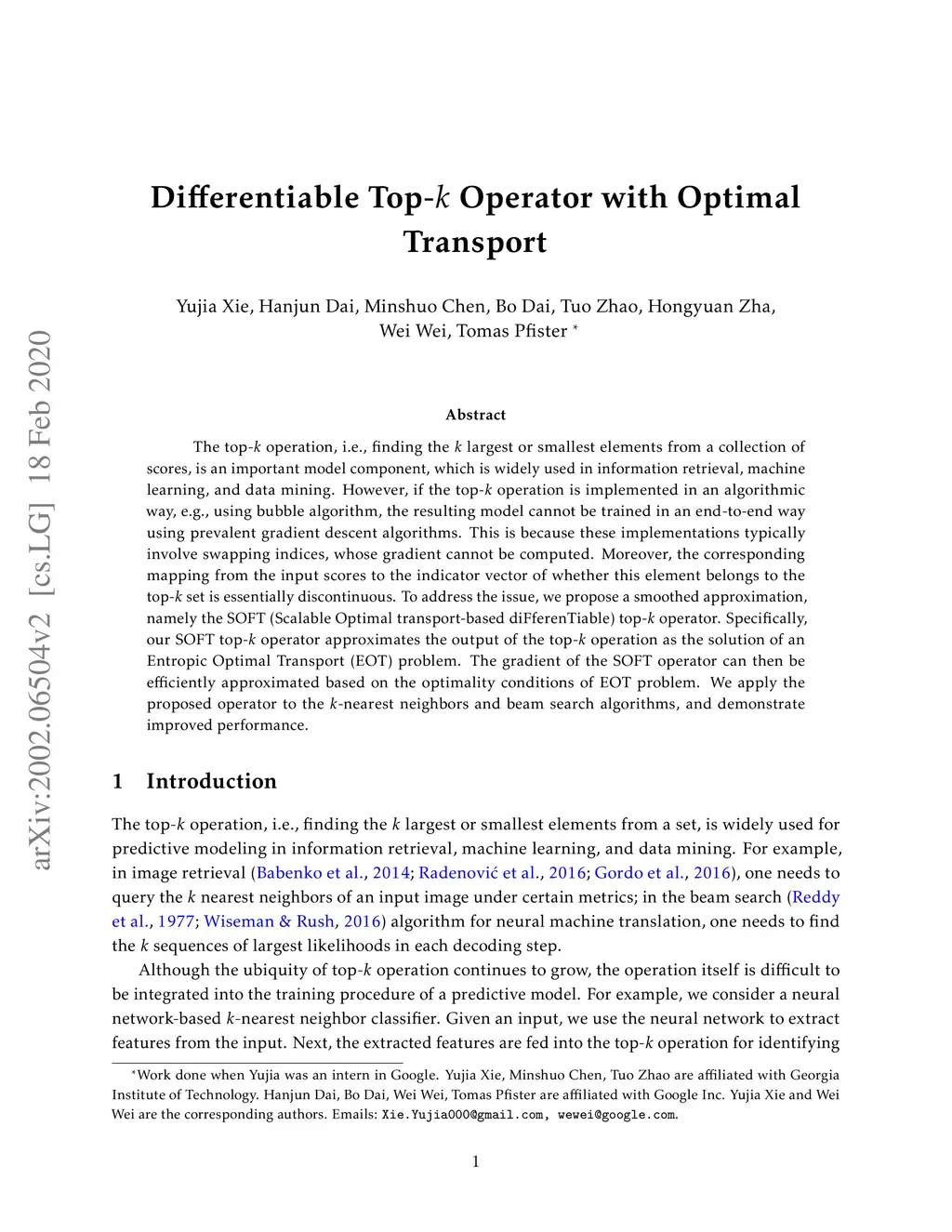 The top-k operation, i.e., finding the k largest or smallest elements from a collection of scores, is an important model component, which is widely used in information retrieval, machine learning, and data mining. However, if the top-k operation is implemented in an algorithmic way, e.g., using bubble algorithm, the resulting model cannot be trained in an end-to-end way using prevalent gradient descent algorithms. This is because these implementations typically involve swapping indices, whose gradient cannot be computed. Moreover, the corresponding mapping from the input scores to the indicator vector of whether this element belongs to the top-k set is essentially discontinuous. To address the issue, we propose a smoothed approximation, namely the SOFT (Scalable Optimal transport-based diFferenTiable) top-k operator. Specifically, our SOFT top-k operator approximates the output of the top-k operation as the solution of an Entropic Optimal Transport (EOT) problem. The gradient of the SOFT operator can then be efficiently approximated based on the optimality conditions of EOT problem. We apply the proposed operator to the k-nearest neighbors and beam search algorithms, and demonstrate improved performance.