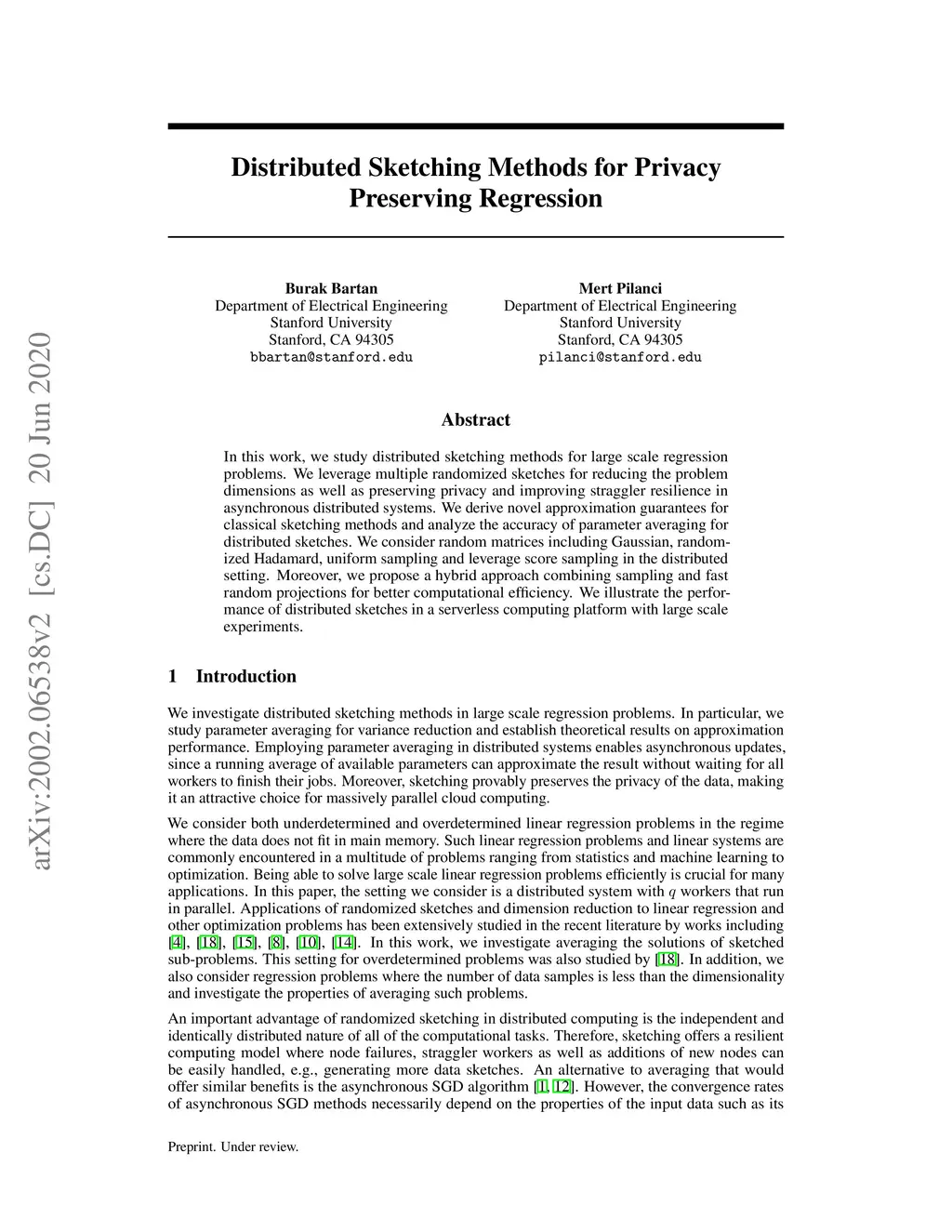 In this work, we study distributed sketching methods for large scale regression problems. We leverage multiple randomized sketches for reducing the problem dimensions as well as preserving privacy and improving straggler resilience in asynchronous distributed systems. We derive novel approximation guarantees for classical sketching methods and analyze the accuracy of parameter averaging for distributed sketches. We consider random matrices including Gaussian, randomized Hadamard, uniform sampling and leverage score sampling in the distributed setting. Moreover, we propose a hybrid approach combining sampling and fast random projections for better computational efficiency. We illustrate the performance of distributed sketches in a serverless computing platform with large scale experiments.