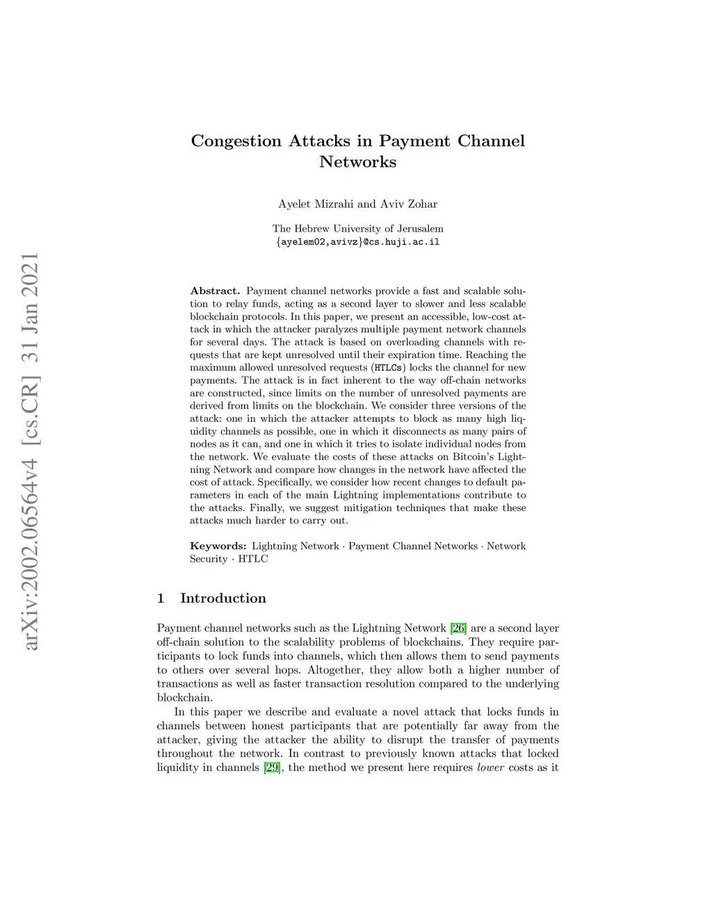 Payment channel networks provide a fast and scalable solution to relay funds, acting as a second layer to slower and less scalable blockchain protocols. In this paper, we present an accessible, low-cost attack in which the attacker paralyzes multiple payment network channels for several days. The attack is based on overloading channels with requests that are kept unresolved until their expiration time. Reaching the maximum allowed unresolved requests (HTLCs) locks the channel for new payments. The attack is in fact inherent to the way off-chain networks are constructed, since limits on the number of unresolved payments are derived from limits on the blockchain. We consider three main versions of the attack: one in which the attacker attempts to block as many high liquidity channels as possible, one in which it disconnects as many pairs of nodes as it can, and one in which it tries to isolate individual nodes from the network. We evaluate the costs of these attacks on Bitcoin's Lightning Network and compare how changes in the network have affected the cost of attack. Specifically, we consider how recent changes to default parameters in each of the main Lightning implementations contribute to the attacks. As we evaluate the attacks, we also look at statistics on parameters in the Lightning Network, which are of independent interest and compare the various implementations of Lightning nodes. Finally, we suggest mitigation techniques that make these attacks much harder to carry out.