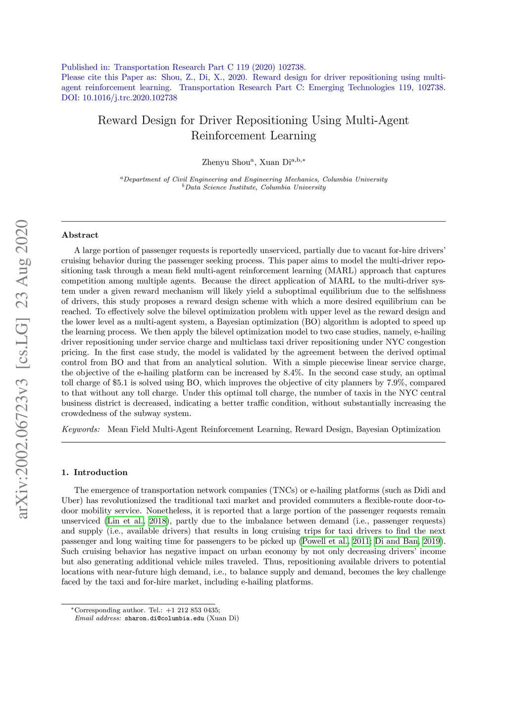 A large portion of passenger requests is reportedly unserviced, partially due to vacant for-hire drivers' cruising behavior during the passenger seeking process. This paper aims to model the multi-driver repositioning task through a mean field multi-agent reinforcement learning (MARL) approach that captures competition among multiple agents. Because the direct application of MARL to the multi-driver system under a given reward mechanism will likely yield a suboptimal equilibrium due to the selfishness of drivers, this study proposes a reward design scheme with which a more desired equilibrium can be reached. To effectively solve the bilevel optimization problem with upper level as the reward design and the lower level as a multi-agent system, a Bayesian optimization (BO) algorithm is adopted to speed up the learning process. We then apply the bilevel optimization model to two case studies, namely, e-hailing driver repositioning under service charge and multiclass taxi driver repositioning under NYC congestion pricing. In the first case study, the model is validated by the agreement between the derived optimal control from BO and that from an analytical solution. With a simple piecewise linear service charge, the objective of the e-hailing platform can be increased by 8.4%. In the second case study, an optimal toll charge of $5.1 is solved using BO, which improves the objective of city planners by 7.9%, compared to that without any toll charge. Under this optimal toll charge, the number of taxis in the NYC central business district is decreased, indicating a better traffic condition, without substantially increasing the crowdedness of the subway system.