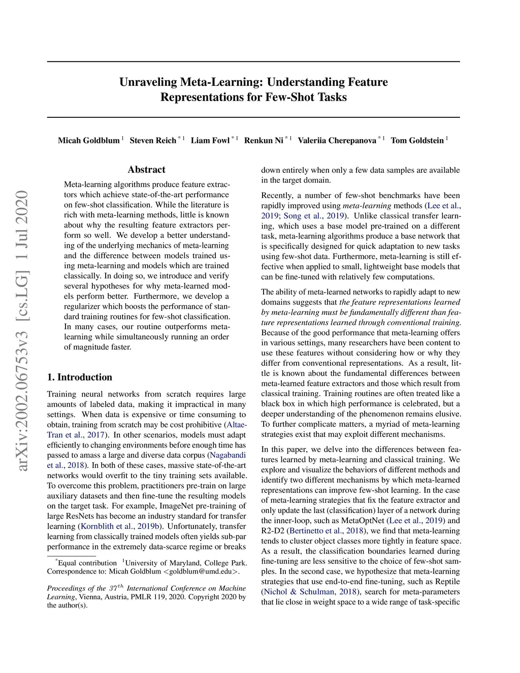 Meta-learning algorithms produce feature extractors which achieve state-of-the-art performance on few-shot classification. While the literature is rich with meta-learning methods, little is known about why the resulting feature extractors perform so well. We develop a better understanding of the underlying mechanics of meta-learning and the difference between models trained using meta-learning and models which are trained classically. In doing so, we introduce and verify several hypotheses for why meta-learned models perform better. Furthermore, we develop a regularizer which boosts the performance of standard training routines for few-shot classification. In many cases, our routine outperforms meta-learning while simultaneously running an order of magnitude faster.