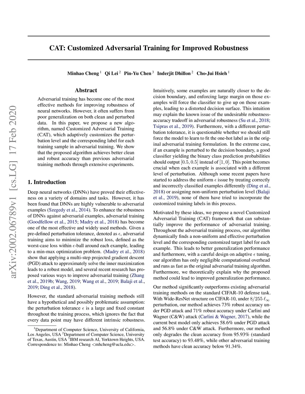 Adversarial training has become one of the most effective methods for improving robustness of neural networks. However, it often suffers from poor generalization on both clean and perturbed data. In this paper, we propose a new algorithm, named Customized Adversarial Training (CAT), which adaptively customizes the perturbation level and the corresponding label for each training sample in adversarial training. We show that the proposed algorithm achieves better clean and robust accuracy than previous adversarial training methods through extensive experiments.