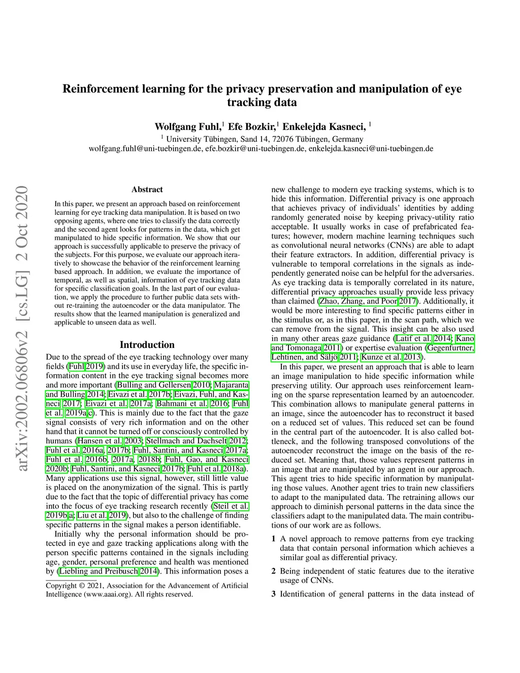 In this paper, we present an approach based on reinforcement learning for eye tracking data manipulation. It is based on two opposing agents, where one tries to classify the data correctly and the second agent looks for patterns in the data, which get manipulated to hide specific information. We show that our approach is successfully applicable to preserve the privacy of the subjects. For this purpose, we evaluate our approach iteratively to showcase the behavior of the reinforcement learning based approach. In addition, we evaluate the importance of temporal, as well as spatial, information of eye tracking data for specific classification goals. In the last part of our evaluation, we apply the procedure to further public data sets without re-training the autoencoder or the data manipulator. The results show that the learned manipulation is generalized and applicable to unseen data as well.