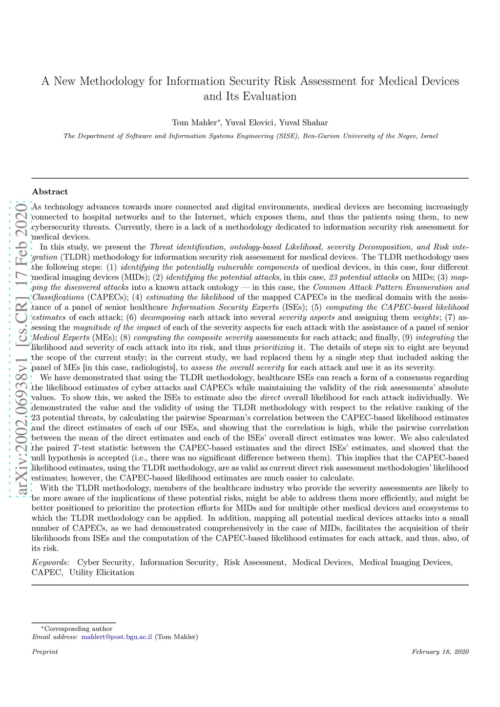 As technology advances towards more connected and digital environments, medical devices are becoming increasingly connected to hospital networks and to the Internet, which exposes them, and thus the patients using them, to new cybersecurity threats. Currently, there is a lack of a methodology dedicated to information security risk assessment for medical devices. In this study, we present the Threat identification, ontology-based Likelihood, severity Decomposition, and Risk integration (TLDR) methodology for information security risk assessment for medical devices. The TLDR methodology uses the following steps: (1) identifying the potentially vulnerable components of medical devices, in this case, four different medical imaging devices (MIDs); (2) identifying the potential attacks, in this case, 23 potential attacks on MIDs; (3) mapping the discovered attacks into a known attack ontology - in this case, the Common Attack Pattern Enumeration and Classifications (CAPECs); (4) estimating the likelihood of the mapped CAPECs in the medical domain with the assistance of a panel of senior healthcare Information Security Experts (ISEs); (5) computing the CAPEC-based likelihood estimates of each attack; (6) decomposing each attack into several severity aspects and assigning them weights; (7) assessing the magnitude of the impact of each of the severity aspects for each attack with the assistance of a panel of senior Medical Experts (MEs); (8) computing the composite severity assessments for each attack; and finally, (9) integrating the likelihood and severity of each attack into its risk, and thus prioritizing it. The details of steps six to eight are beyond the scope of the current study; in the current study, we had replaced them by a single step that included asking the panel of MEs [in this case, radiologists], to assess the overall severity for each attack and use it as its severity...