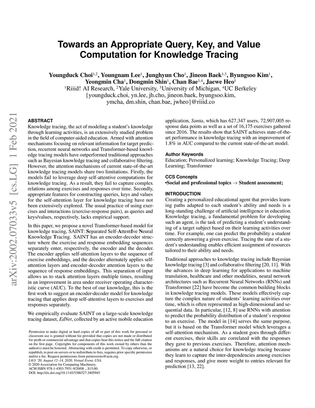 Knowledge tracing, the act of modeling a student's knowledge through learning activities, is an extensively studied problem in the field of computer-aided education. Although models with attention mechanism have outperformed traditional approaches such as Bayesian knowledge tracing and collaborative filtering, they share two limitations. Firstly, the models rely on shallow attention layers and fail to capture complex relations among exercises and responses over time. Secondly, different combinations of queries, keys and values for the self-attention layer for knowledge tracing were not extensively explored. Usual practice of using exercises and interactions (exercise-response pairs) as queries and keys/values respectively lacks empirical support. In this paper, we propose a novel Transformer based model for knowledge tracing, SAINT: Separated Self-AttentIve Neural Knowledge Tracing. SAINT has an encoder-decoder structure where exercise and response embedding sequence separately enter the encoder and the decoder respectively, which allows to stack attention layers multiple times. To the best of our knowledge, this is the first work to suggest an encoder-decoder model for knowledge tracing that applies deep self-attentive layers to exercises and responses separately. The empirical evaluations on a large-scale knowledge tracing dataset show that SAINT achieves the state-of-the-art performance in knowledge tracing with the improvement of AUC by 1.8% compared to the current state-of-the-art models.