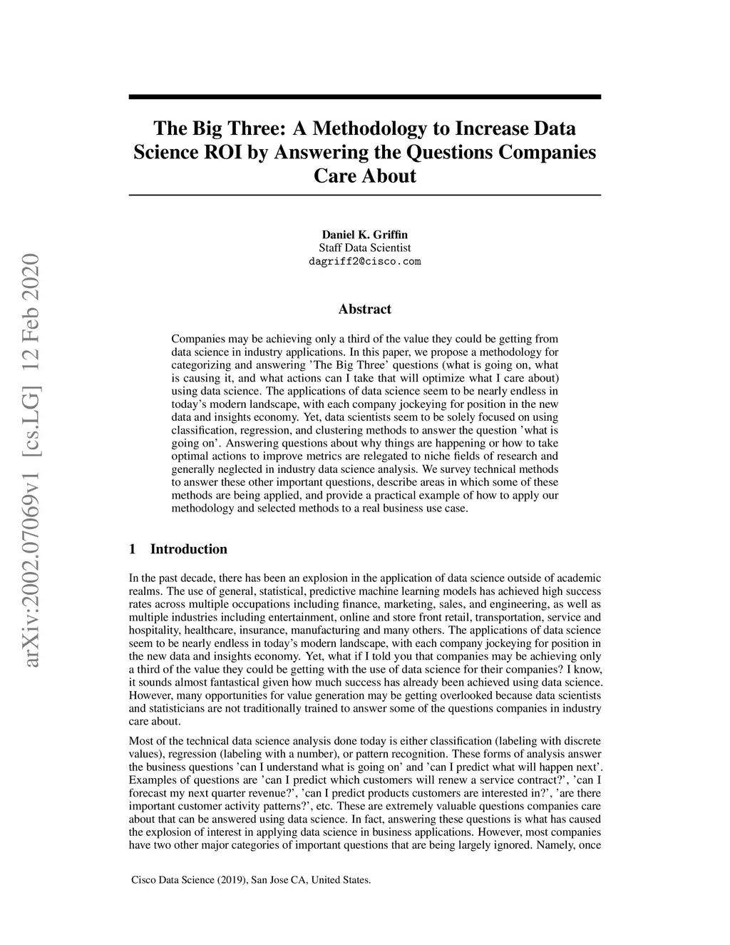 Companies may be achieving only a third of the value they could be getting from data science in industry applications. In this paper, we propose a methodology for categorizing and answering 'The Big Three' questions (what is going on, what is causing it, and what actions can I take that will optimize what I care about) using data science. The applications of data science seem to be nearly endless in today's modern landscape, with each company jockeying for position in the new data and insights economy. Yet, data scientists seem to be solely focused on using classification, regression, and clustering methods to answer the question 'what is going on'. Answering questions about why things are happening or how to take optimal actions to improve metrics are relegated to niche fields of research and generally neglected in industry data science analysis. We survey technical methods to answer these other important questions, describe areas in which some of these methods are being applied, and provide a practical example of how to apply our methodology and selected methods to a real business use case.