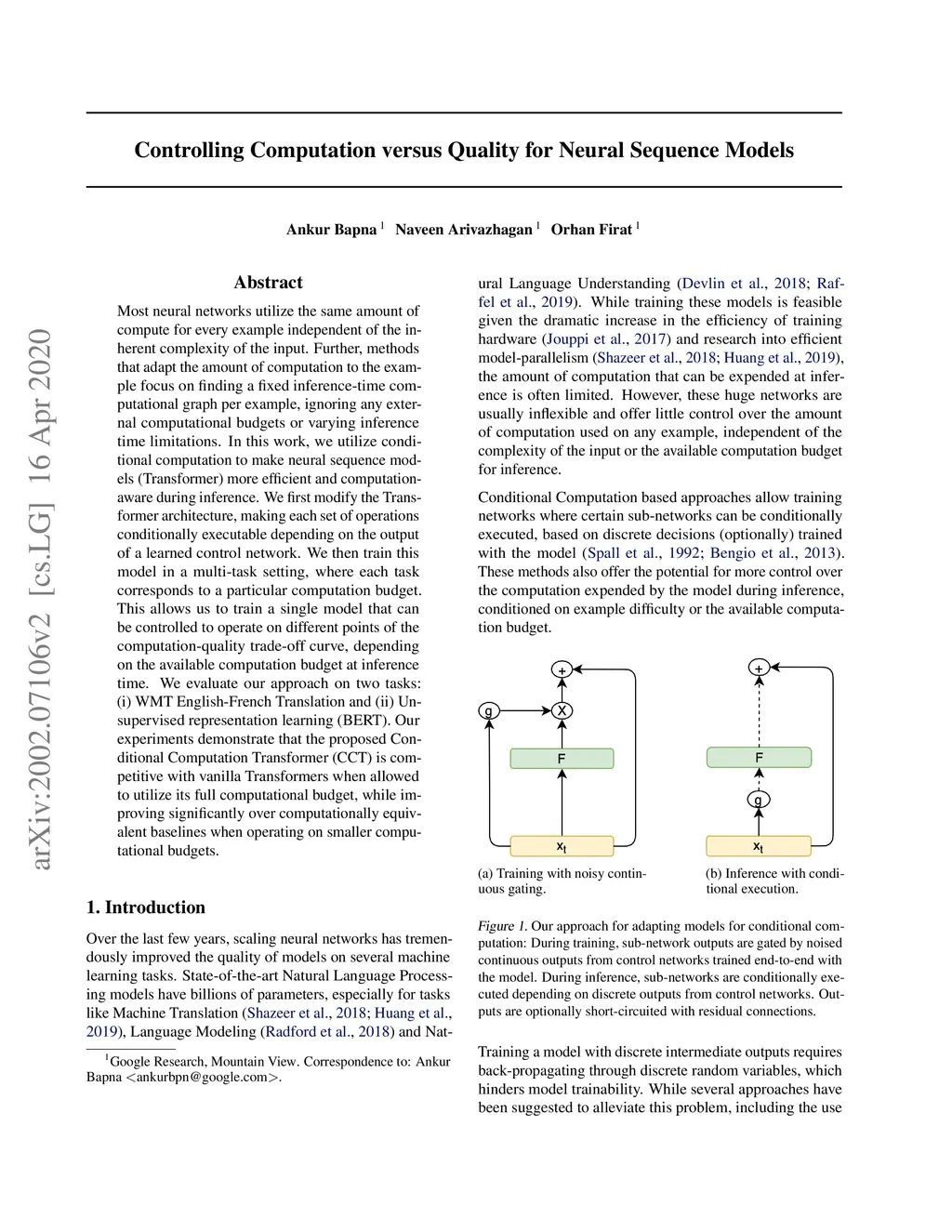 Most neural networks utilize the same amount of compute for every example independent of the inherent complexity of the input. Further, methods that adapt the amount of computation to the example focus on finding a fixed inference-time computational graph per example, ignoring any external computational budgets or varying inference time limitations. In this work, we utilize conditional computation to make neural sequence models (Transformer) more efficient and computation-aware during inference. We first modify the Transformer architecture, making each set of operations conditionally executable depending on the output of a learned control network. We then train this model in a multi-task setting, where each task corresponds to a particular computation budget. This allows us to train a single model that can be controlled to operate on different points of the computation-quality trade-off curve, depending on the available computation budget at inference time. We evaluate our approach on two tasks: (i) WMT English-French Translation and (ii) Unsupervised representation learning (BERT). Our experiments demonstrate that the proposed Conditional Computation Transformer (CCT) is competitive with vanilla Transformers when allowed to utilize its full computational budget, while improving significantly over computationally equivalent baselines when operating on smaller computational budgets.