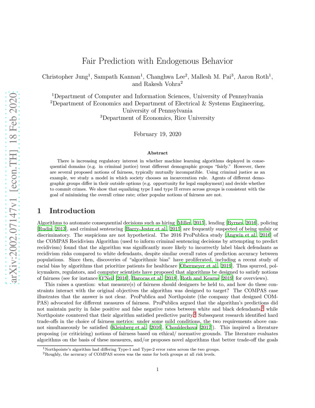 There is increasing regulatory interest in whether machine learning algorithms deployed in consequential domains (e.g. in criminal justice) treat different demographic groups "fairly." However, there are several proposed notions of fairness, typically mutually incompatible. Using criminal justice as an example, we study a model in which society chooses an incarceration rule. Agents of different demographic groups differ in their outside options (e.g. opportunity for legal employment) and decide whether to commit crimes. We show that equalizing type I and type II errors across groups is consistent with the goal of minimizing the overall crime rate; other popular notions of fairness are not.