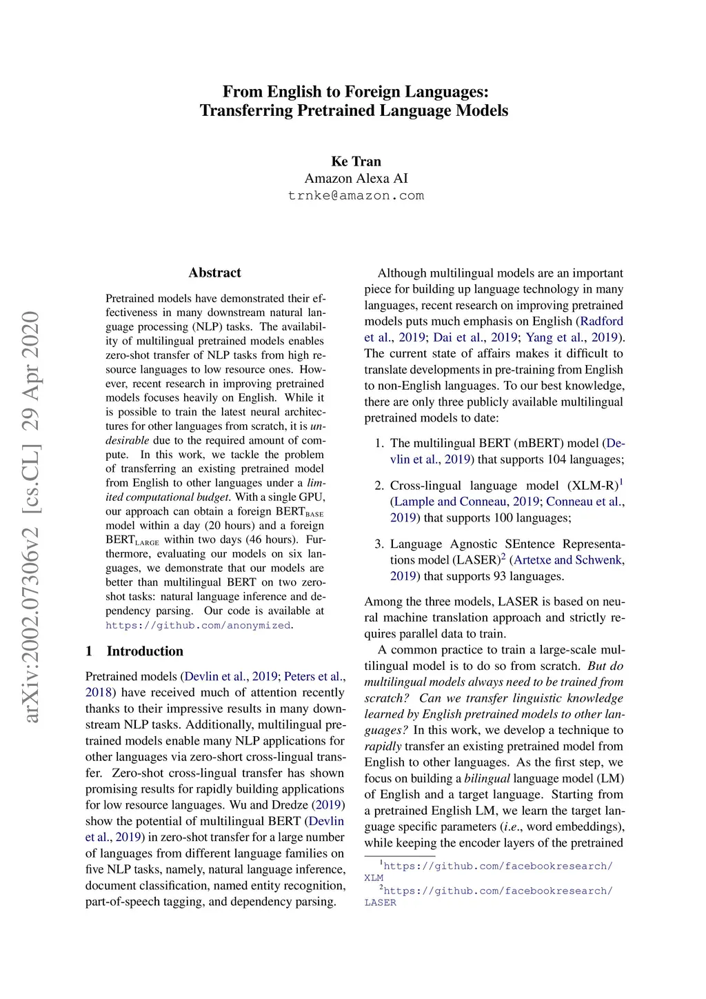 Pre-trained models have demonstrated their effectiveness in many downstream natural language processing (NLP) tasks. The availability of multilingual pre-trained models enables zero-shot transfer of NLP tasks from high resource languages to low resource ones. However, recent research in improving pre-trained models focuses heavily on English. While it is possible to train the latest neural architectures for other languages from scratch, it is undesirable due to the required amount of compute. In this work, we tackle the problem of transferring an existing pre-trained model from English to other languages under a limited computational budget. With a single GPU, our approach can obtain a foreign BERT base model within a day and a foreign BERT large within two days. Furthermore, evaluating our models on six languages, we demonstrate that our models are better than multilingual BERT on two zero-shot tasks: natural language inference and dependency parsing.