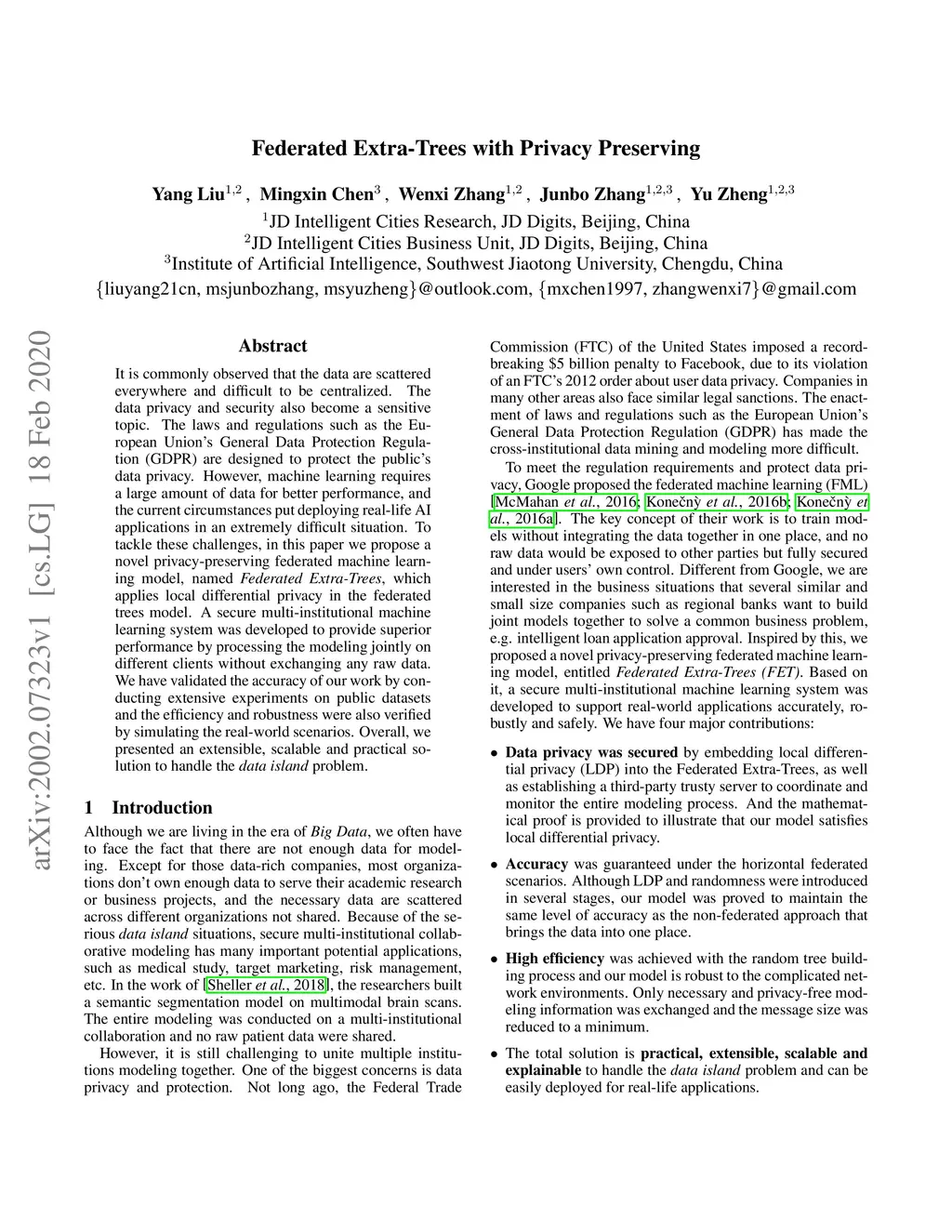 It is commonly observed that the data are scattered everywhere and difficult to be centralized. The data privacy and security also become a sensitive topic. The laws and regulations such as the European Union's General Data Protection Regulation (GDPR) are designed to protect the public's data privacy. However, machine learning requires a large amount of data for better performance, and the current circumstances put deploying real-life AI applications in an extremely difficult situation. To tackle these challenges, in this paper we propose a novel privacy-preserving federated machine learning model, named Federated Extra-Trees, which applies local differential privacy in the federated trees model. A secure multi-institutional machine learning system was developed to provide superior performance by processing the modeling jointly on different clients without exchanging any raw data. We have validated the accuracy of our work by conducting extensive experiments on public datasets and the efficiency and robustness were also verified by simulating the real-world scenarios. Overall, we presented an extensible, scalable and practical solution to handle the data island problem.