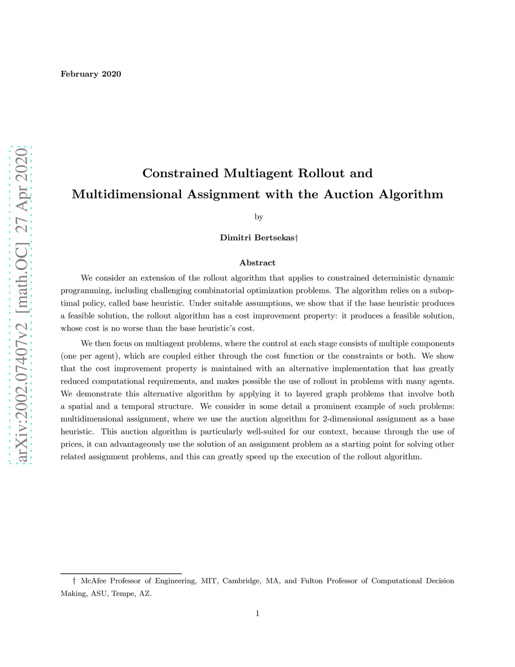 We consider an extension of the rollout algorithm that applies to constrained deterministic dynamic programming, including challenging combinatorial optimization problems. The algorithm relies on a suboptimal policy, called base heuristic. Under suitable assumptions, we show that if the base heuristic produces a feasible solution, the rollout algorithm has a cost improvement property: it produces a feasible solution, whose cost is no worse than the base heuristic's cost. We then focus on multiagent problems, where the control at each stage consists of multiple components (one per agent), which are coupled either through the cost function or the constraints or both. We show that the cost improvement property is maintained with an alternative implementation that has greatly reduced computational requirements, and makes possible the use of rollout in problems with many agents. We demonstrate this alternative algorithm by applying it to layered graph problems that involve both a spatial and a temporal structure. We consider in some detail a prominent example of such problems: multidimensional assignment, where we use the auction algorithm for 2-dimensional assignment as a base heuristic. This auction algorithm is particularly well-suited for our context, because through the use of prices, it can advantageously use the solution of an assignment problem as a starting point for solving other related assignment problems, and this can greatly speed up the execution of the rollout algorithm.