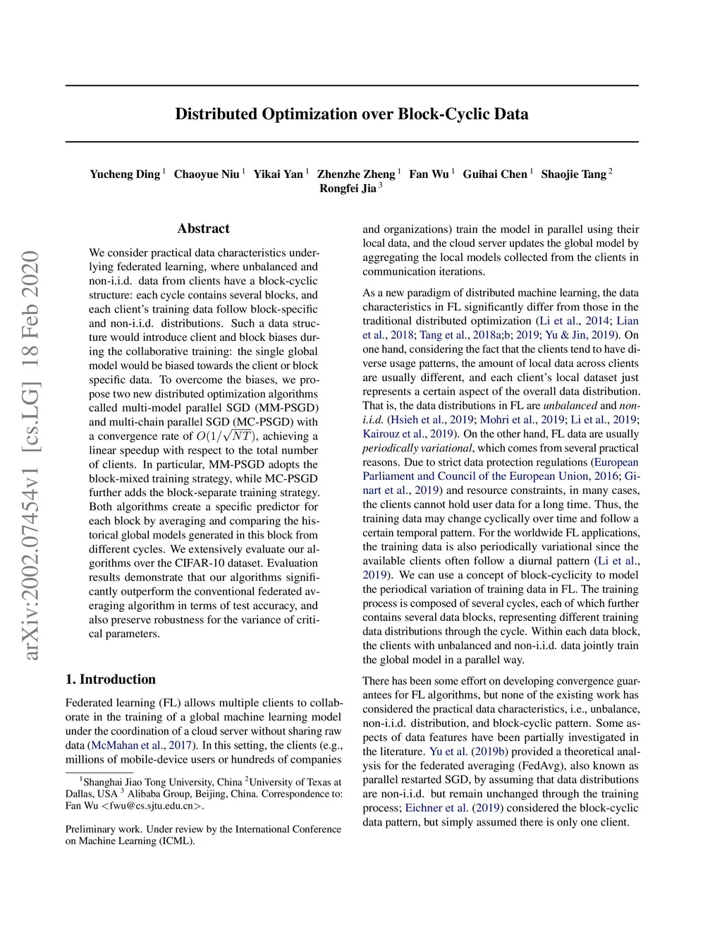 We consider practical data characteristics underlying federated learning, where unbalanced and non-i.i.d. data from clients have a block-cyclic structure: each cycle contains several blocks, and each client's training data follow block-specific and non-i.i.d. distributions. Such a data structure would introduce client and block biases during the collaborative training: the single global model would be biased towards the client or block specific data. To overcome the biases, we propose two new distributed optimization algorithms called multi-model parallel SGD (MM-PSGD) and multi-chain parallel SGD (MC-PSGD) with a convergence rate of , achieving a linear speedup with respect to the total number of clients. In particular, MM-PSGD adopts the block-mixed training strategy, while MC-PSGD further adds the block-separate training strategy. Both algorithms create a specific predictor for each block by averaging and comparing the historical global models generated in this block from different cycles. We extensively evaluate our algorithms over the CIFAR-10 dataset. Evaluation results demonstrate that our algorithms significantly outperform the conventional federated averaging algorithm in terms of test accuracy, and also preserve robustness for the variance of critical parameters.