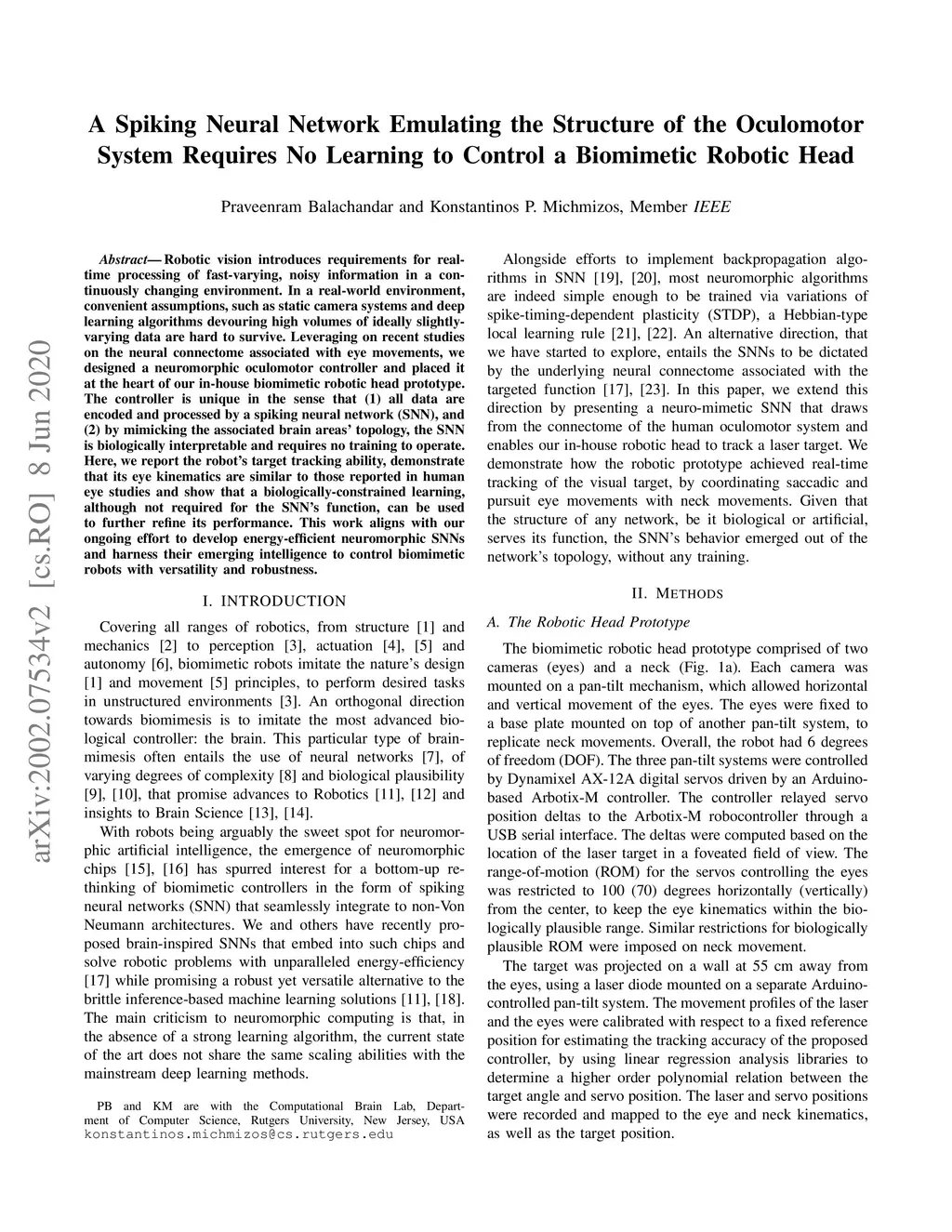 Robotic vision introduces requirements for real-time processing of fast-varying, noisy information in a continuously changing environment. In a real-world environment, convenient assumptions, such as static camera systems and deep learning algorithms devouring high volumes of ideally slightly-varying data are hard to survive. Leveraging on recent studies on the neural connectome associated with eye movements, we designed a neuromorphic oculomotor controller and placed it at the heart of our in-house biomimetic robotic head prototype. The controller is unique in the sense that (1) all data are encoded and processed by a spiking neural network (SNN), and (2) by mimicking the associated brain areas' connectivity, the SNN required no training to operate. A biologically-constrained Hebbian learning further improved the SNN performance in tracking a moving target. Here, we report the tracking performance of the robotic head and show that the robotic eye kinematics are similar to those reported in human eye studies. This work contributes to our ongoing effort to develop energy-efficient neuromorphic SNN and harness their emerging intelligence to control biomimetic robots with versatility and robustness.